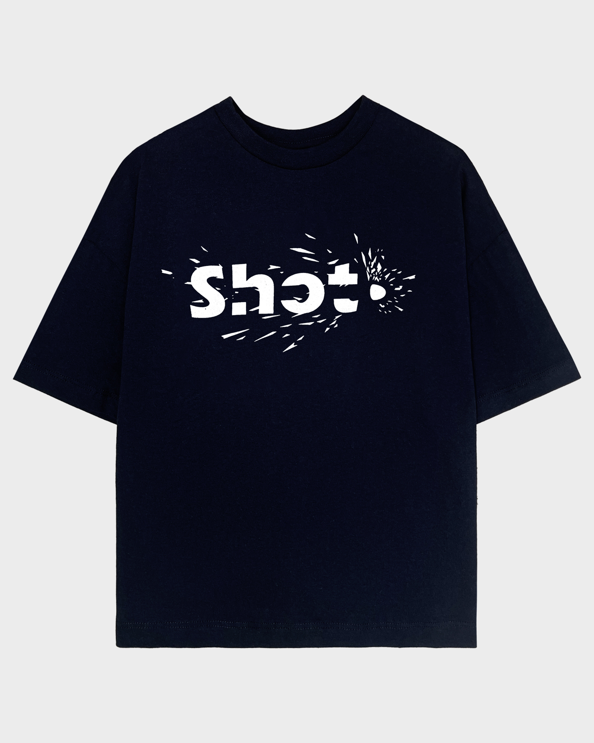Футболка для мальчика свободного силуэта (оверсайз) с коротким рукавом. Горловина круглая, обработана обтачкой из рибаны. Низ изделия и рукава обработаны швом вподгибку. На полочке принт Шелкография. Надпись переводится как "Выстрел".