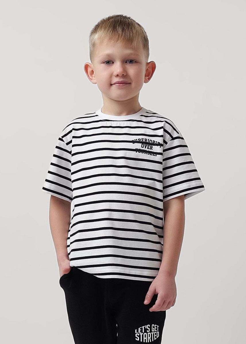 Футболка для мальчика прямого силуэта, со спущенным плечом коротким рукавом. Горловина круглая, обработана воротником из рибаны. Горловина спинки внутри укреплена бейкой из кулирки. По горловине полочки отделочная строчка. Низ изделия и рукавов обработан швом в подгибку. На полочке принт ШЕЛКОГРАФИЯ. Надпись переводится как "Дикая природа".