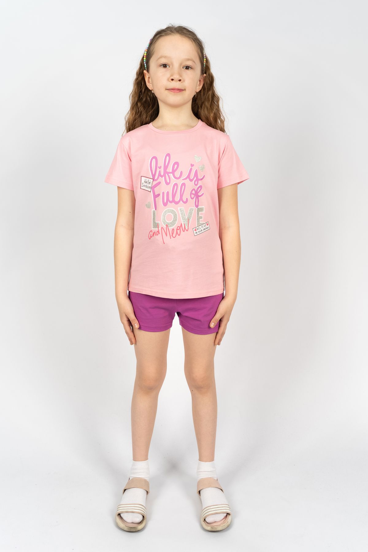 Красивый и очень практичный костюм для девочки состоит из двух предметов. Удобные шорты с эластичной резинкой в поясе, благодаря которой они хорошо держатся на теле, не сдавливая животик малышке. Симпатичная футболка с веселым рисунком. Комплект одежды бренда "Родители и дети" оптом. Производители используют только качественные материалы из хлопка и современные технологии при производстве. Отлично подходит для активных игр.
