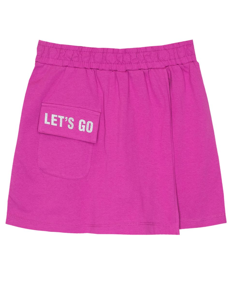 Шорты для девочки прямого силуэта из кулирки с накладным карманом. Пояс отрезной в цвет изделия, выполнен из основного полотна, с эластичной тесьмой внутри. В передней части изделия расположена отлётная часть – имитация запаха, из основного полотна. На отлетной части запаха выполнен накладной карман с клапаном из основного материала. На клапане принт шелкография с глиттером. Низ изделия и отлетная часть запаха обработан швом в подгибку. Надпись переводится как "Вперед".