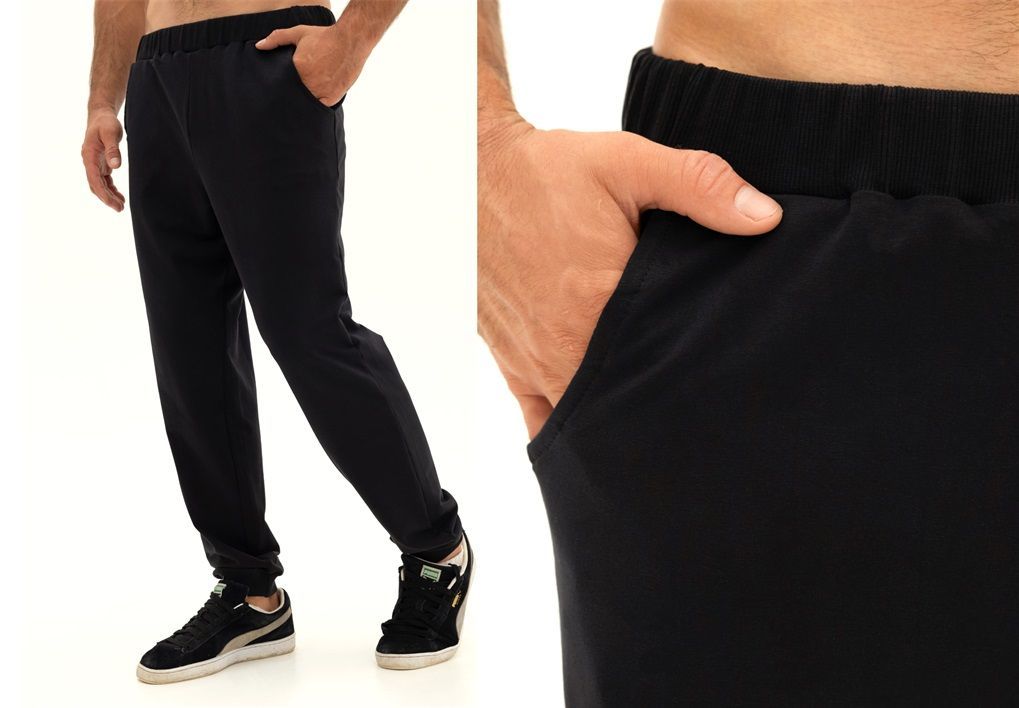 Брюки мужские из флиса, свободного покроя, на притачном поясе с эластичной тесьмой внутри, с карманами в боковых швах. С изнаночной стороны пояса вставлен шнурок для регулирования степени прилегания изделия по талии. Нижние срезы брюк обработаны подгибкой с эластичной тесьмой.