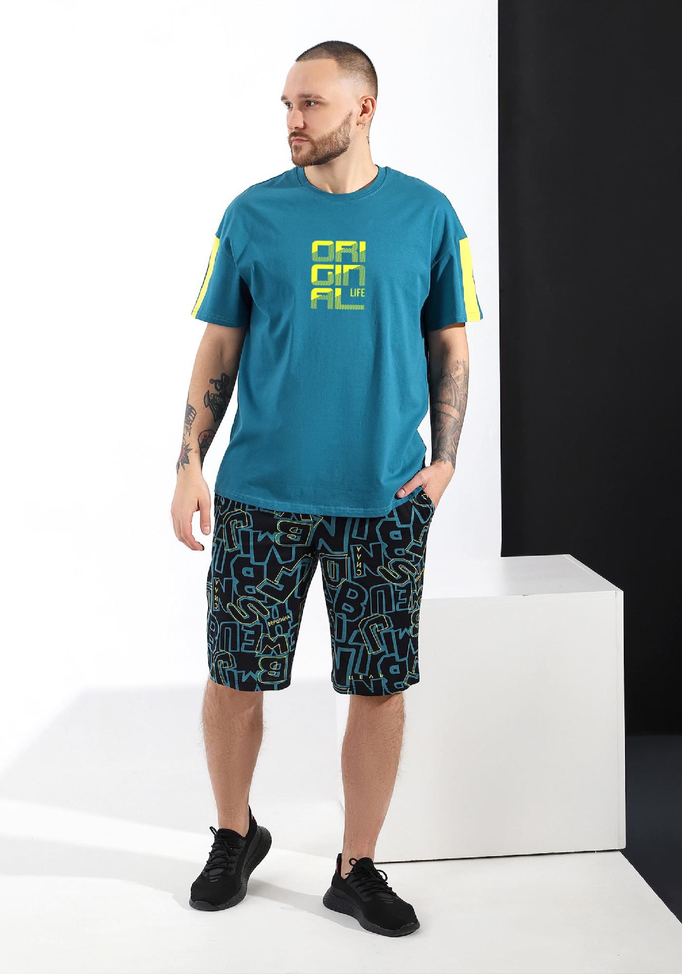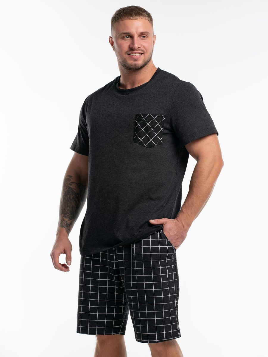 Костюм мужской. Футболка черная с лаконичным принтом, линия плеч спущенная, по фигурной линии на переде и рукавах контрастный кант. Шорты из полотна с рисунком эксклюзивного дизайна; модель с карманами, на притачном поясе с отстроченной эластичной тесьмой.