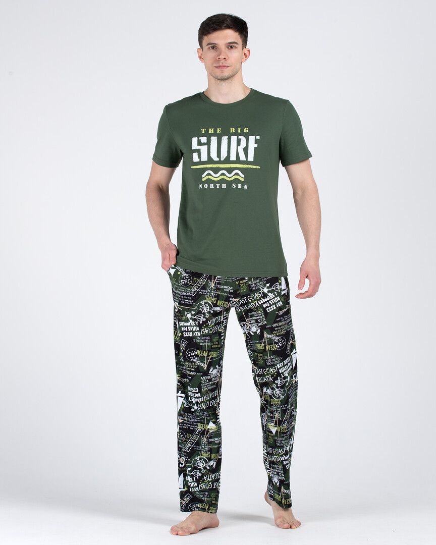 Костюм мужской ,состоящий из футболки и брюк. Футболка - из гладкокрашеного полотна "кулирка", классического покроя, с короткими втачными рукавами, горловиной овальной формы, обработанной втачной планкой, и принтом вцентре переда, выполненным в технике шелкографии. Брюки - из полотна с набивным рисунком, прямого силуэта, на притачном поясе с эластичнойтесьмой внутри и карманами в боковых швах, входы в которые окантованы основным материалом.