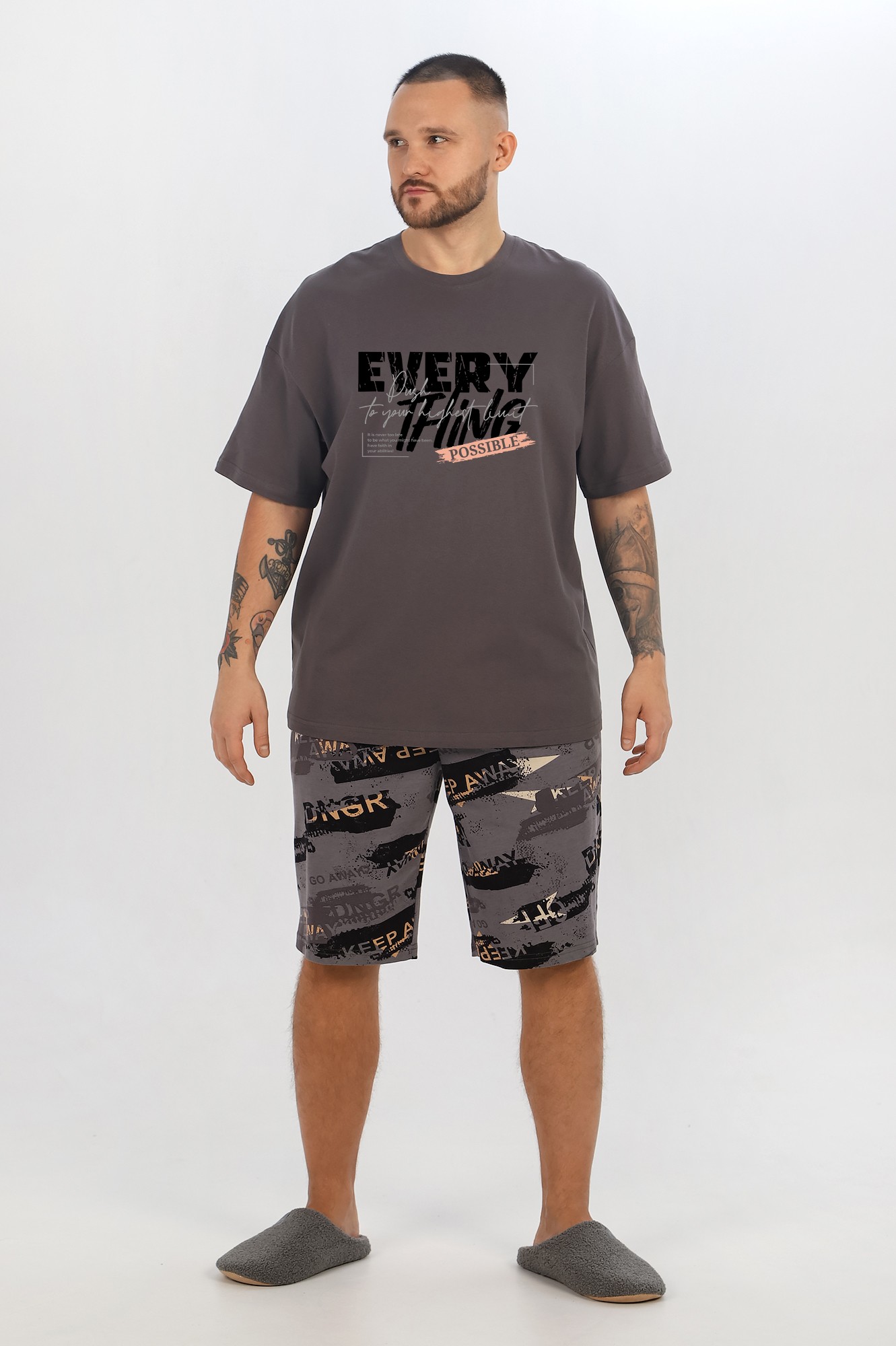 Костюм мужской из хлопчатобумажных трикотажных полотен кулирного переплетения. Однотонная футболка со слегка спущенной линией плеч, округлым вырезом горловины, с принтом. Шорты из полотна с набивным рисунком эксклюзивного дизайна, с боковыми карманами, на притачном поясе из рибаны с отстроченной эластичной тесьмой.