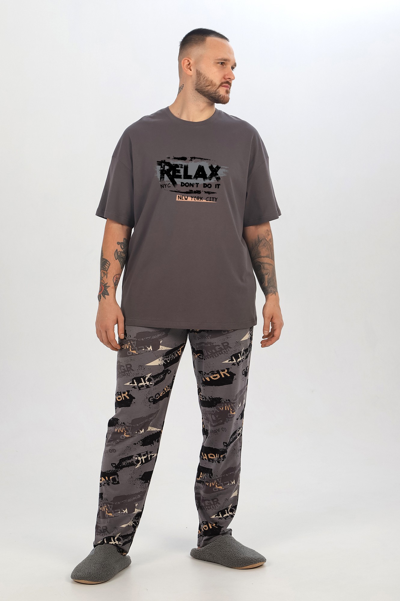 Костюм мужской из хлопчатобумажных трикотажных полотен кулирного переплетения. Футболка с подрезами в области плеч и рукавов, с принтом. Брюки прямые, из полотна с рисунком эксклюзивного дизайна, с карманами, на притачном поясе с отстроченной эластичной тесьмой.