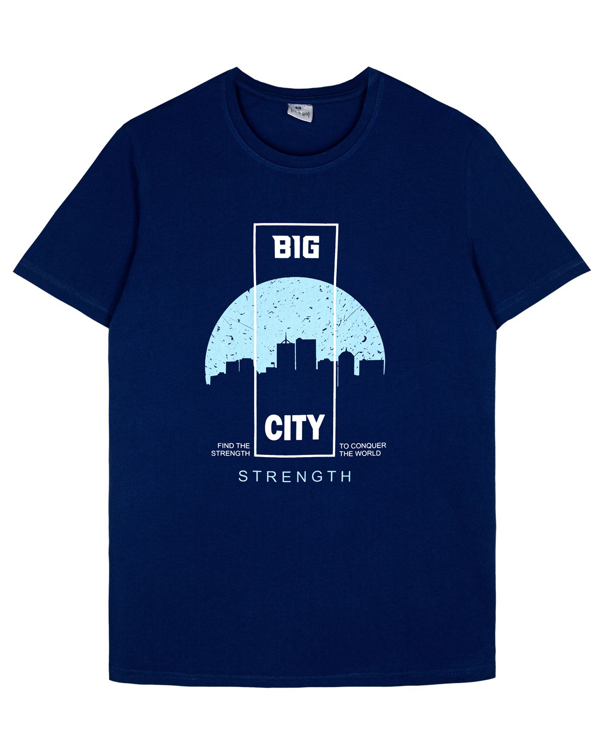 Футболка мужская прямого силуэта с втачным коротким рукавом. Горловина круглая, обработана воротником из рибаны. Горловина спинки внутри укреплена бейкой из кулирки. По горловине полочки отделочная строчка. Низ изделия и рукавов обработан швом в подгибку. На полочке принт шелкография. Надпись переводится как "Большой город; Найди в себе силы, чтобы покорить мир". Модель рассчитана на рост 176-182см.