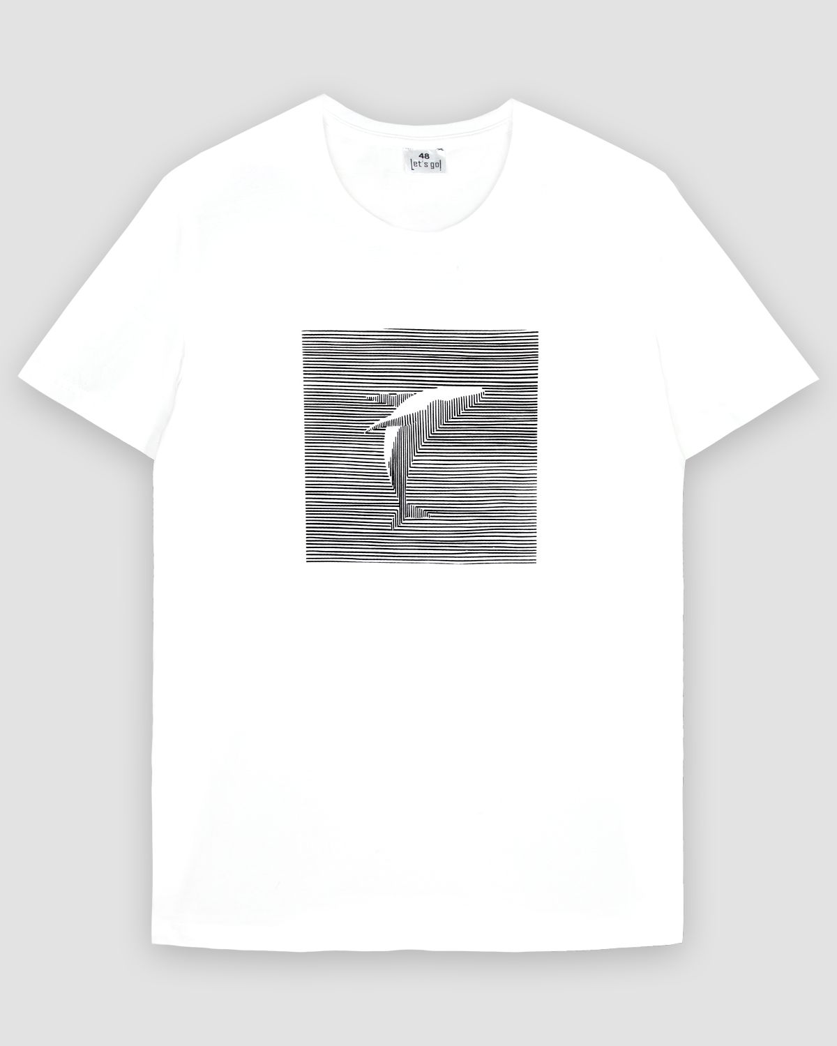 Футболка мужская прямого силуэта с втачным коротким рукавом. Горловина круглая, обработана воротником из рибаны. Горловина спинки внутри укреплена бейкой из кулирки. По горловине полочки отделочная строчка. Низ изделия и рукавов обработан швом в подгибку. На полочке принт шелкография. Модель рассчитана на рост 176-182см.