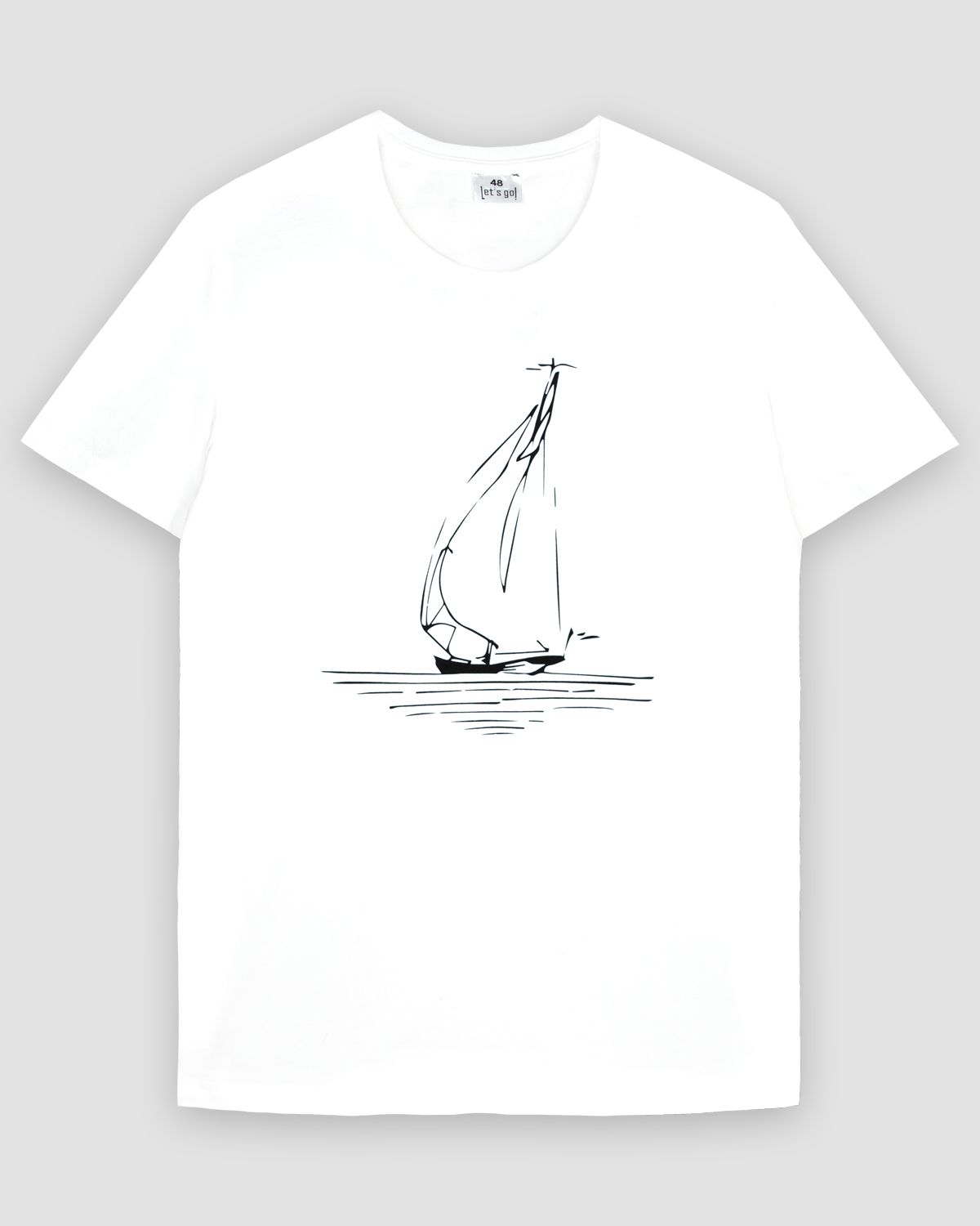 Футболка мужская прямого силуэта с втачным коротким рукавом. Горловина круглая, обработана воротником из рибаны. Горловина спинки внутри укреплена бейкой из кулирки. По горловине полочки отделочная строчка. Низ изделия и рукавов обработан швом в подгибку. На полочке принт шелкография. Модель рассчитана на рост 176-182см.