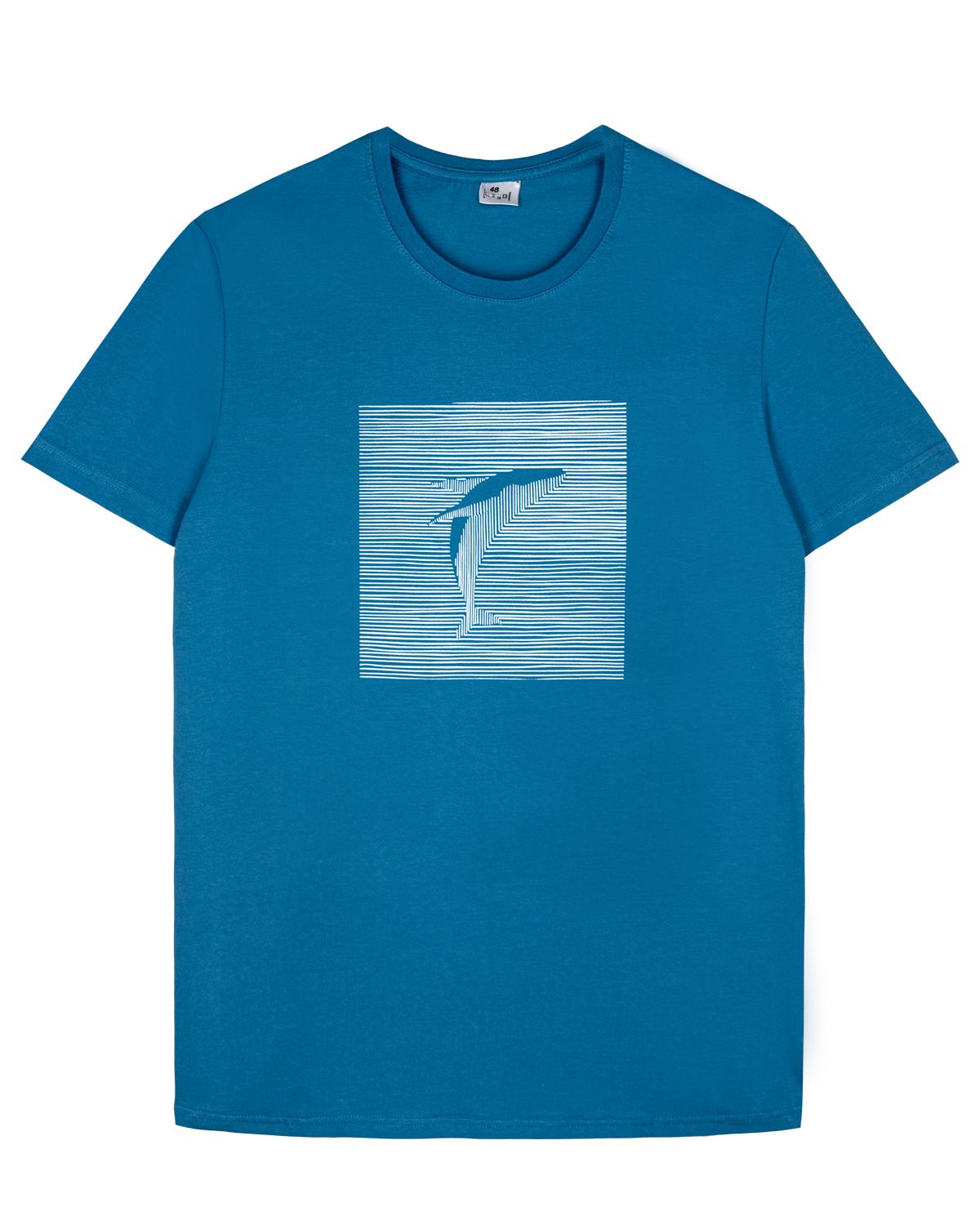 Футболка мужская прямого силуэта с втачным коротким рукавом. Горловина круглая, обработана воротником из рибаны. Горловина спинки внутри укреплена бейкой из кулирки. По горловине полочки отделочная строчка. Низ изделия и рукавов обработан швом в подгибку. На полочке принт шелкография. Модель рассчитана на рост 176-182см.
