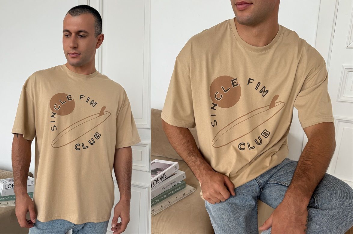 Фуфайка с коротким рукавом среднего объема, круглый вырез, горловина оформлена обтачкой из рибаны. Дополнена оригинальным принтом.