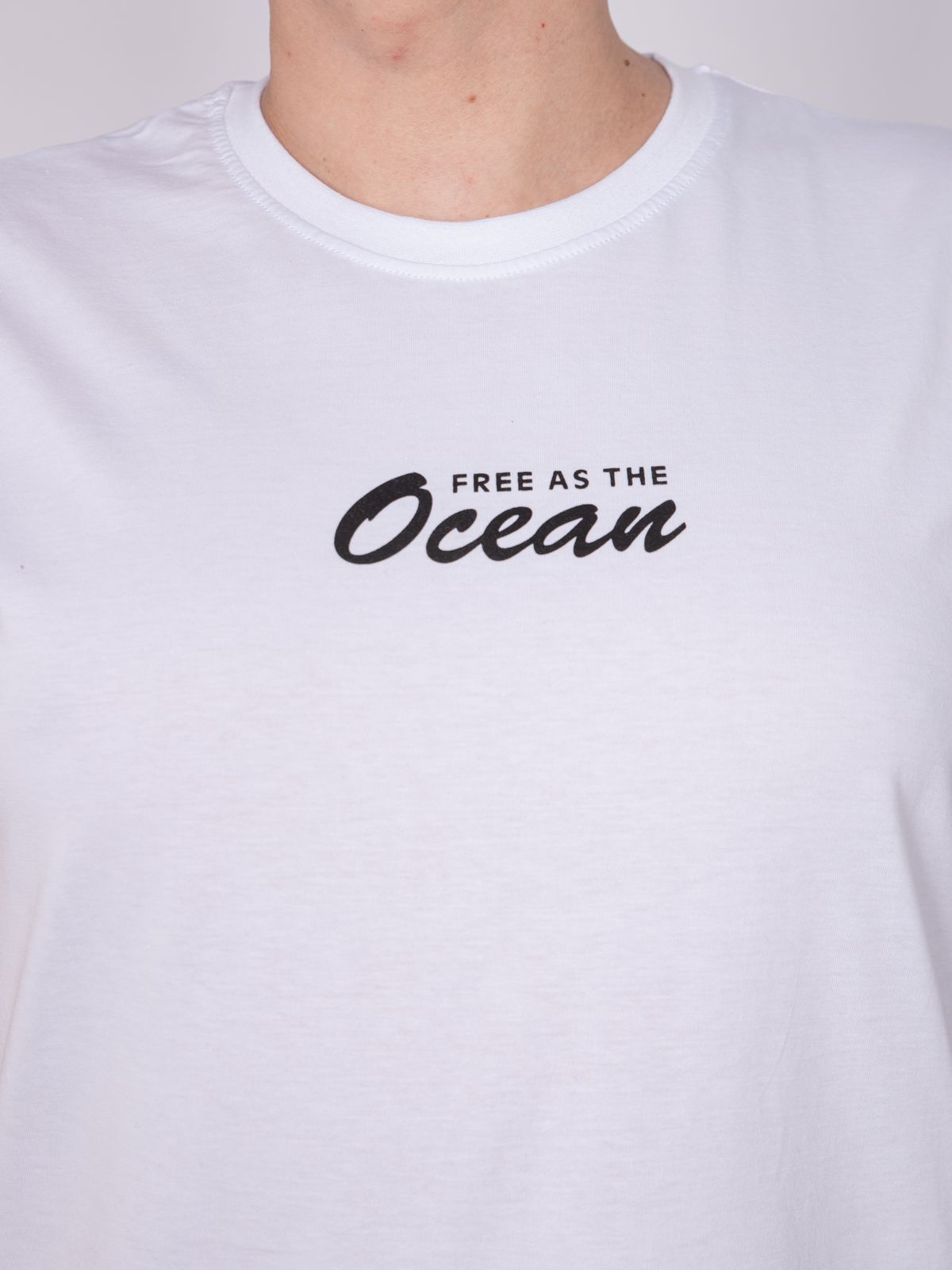 Майка мужская прямого силуэта. Горловина круглая, обработана воротником из рибаны. Горловина спинки внутри укреплена бейкой из кулирки. Низ изделия и рукавов обработан швом вподгибку. На полочке принт ШЕЛКОГРАФИЯ. Надпись переводится как "Свободен как океан". Модель рассчитана на рост 176-182.