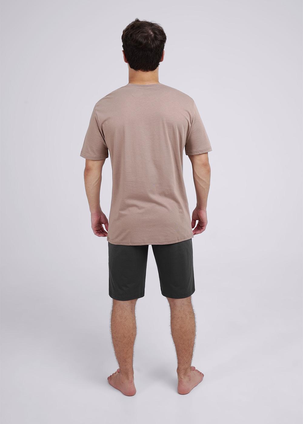 Футболка мужская прямого силуэта с втачным коротким рукавом. Горловина V-образная, обработана воротником из рибаны. Горловина спинки внутри укреплена бейкой из кулирки. По горловине полочки отделочная строчка. Низ изделия и рукавов обработан швом в подгибку. На полочке фотопринт. Надпись переводится как "Все возвращается к реке". Модель рассчитана на рост 176-182см.