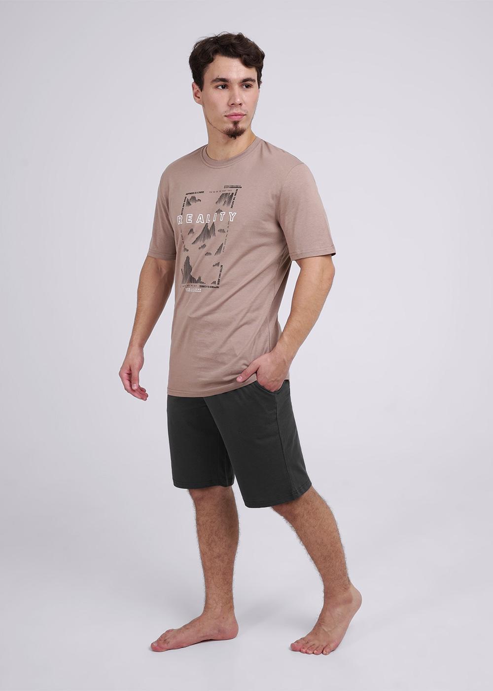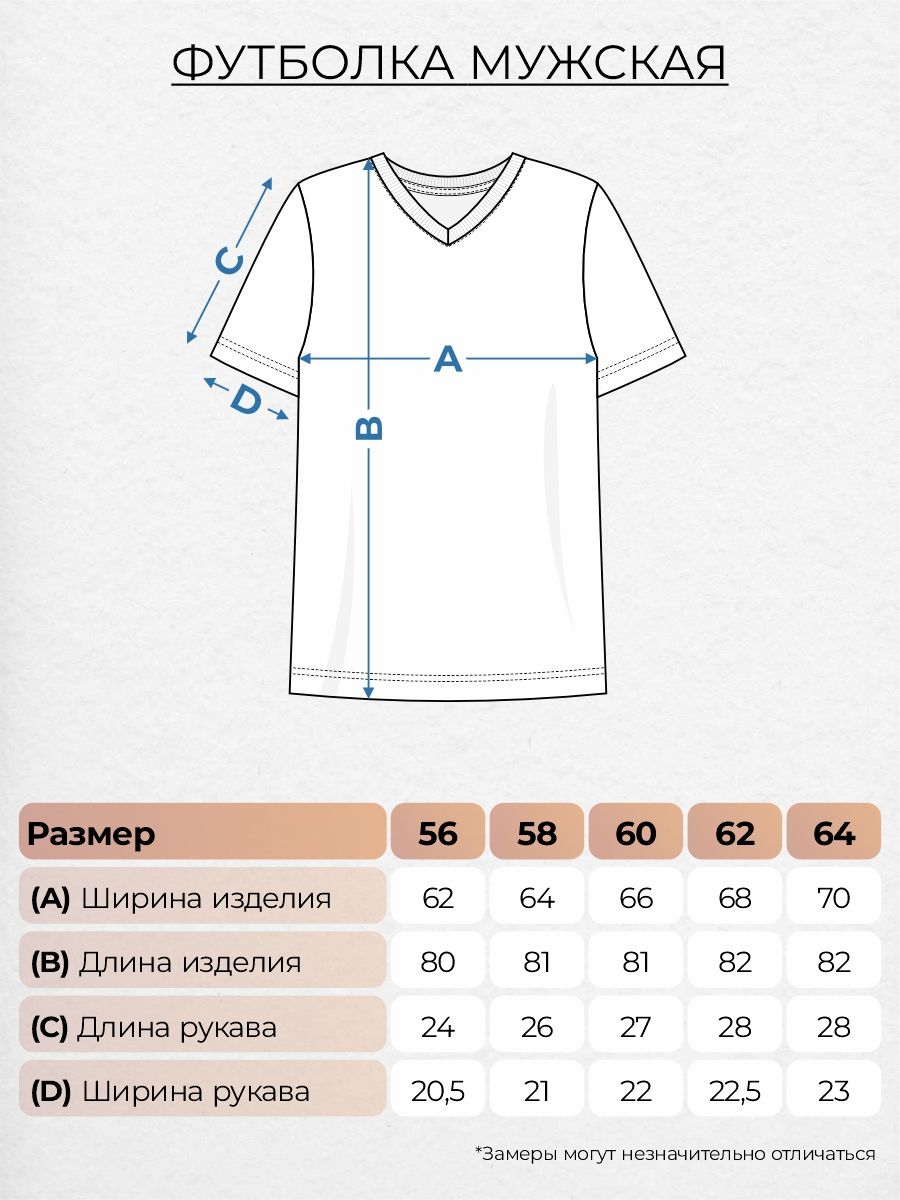 Футболка мужская прямого силуэта с втачным коротким рукавом. Горловина круглая, обработана воротником из рибаны. Горловина спинки внутри укреплена бейкой из кулирки. Низ изделия и рукавов обработан швом в подгибку. На полочке принт ШЕЛКОГРАФИЯ. Надпись Переводится как "Иллюзия". Модель рассчитана на рост 176-182см