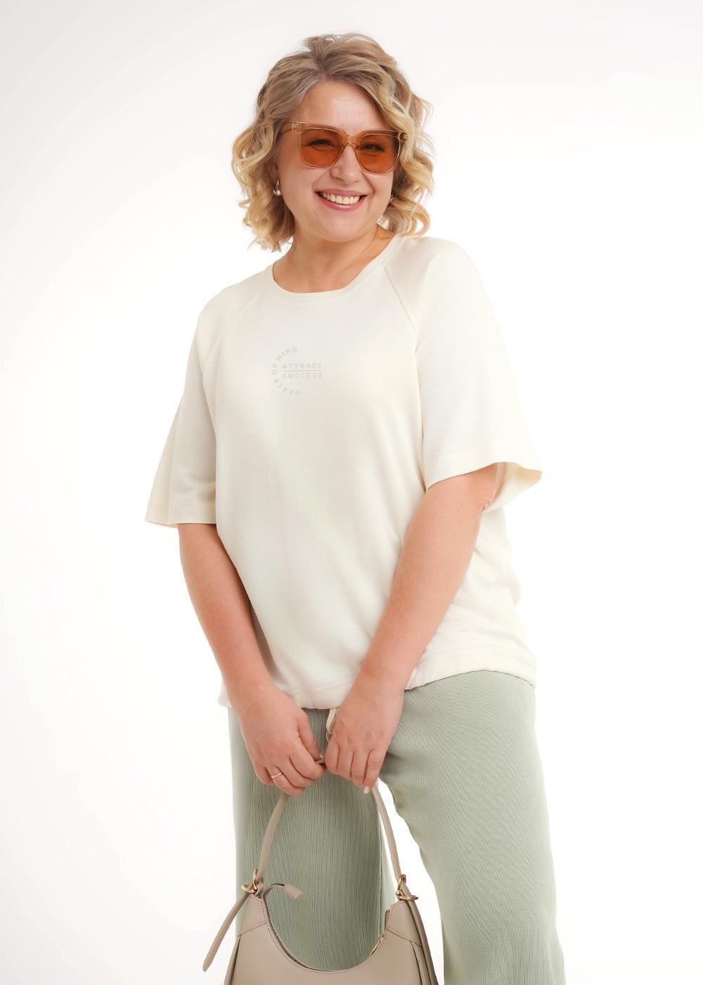 Джемпер из хлопкового трикотажного полотна. Округлая горловина с обтачкой из рибаны, короткий втачной рукав. По низу кулиса. По переду принт фольга.
