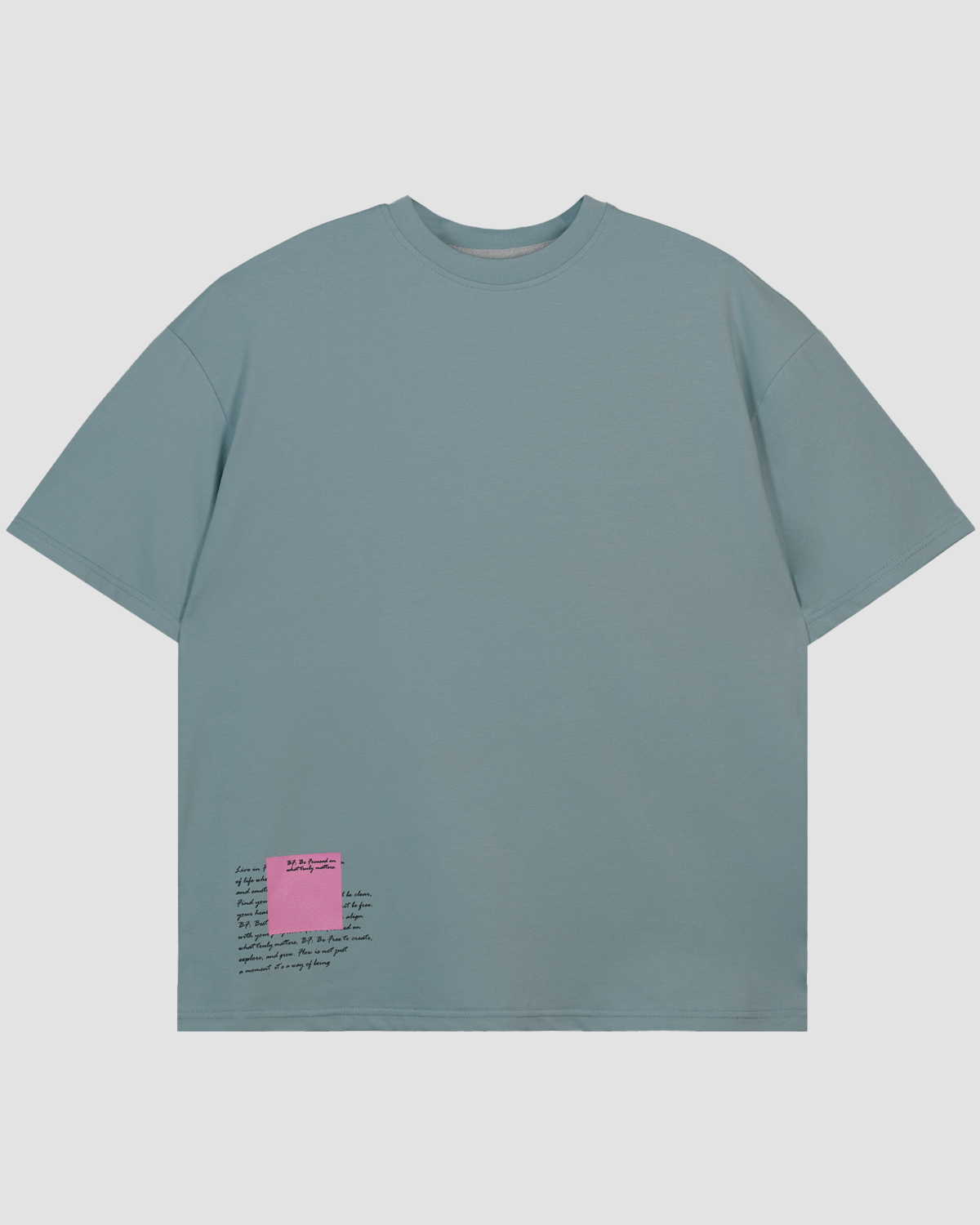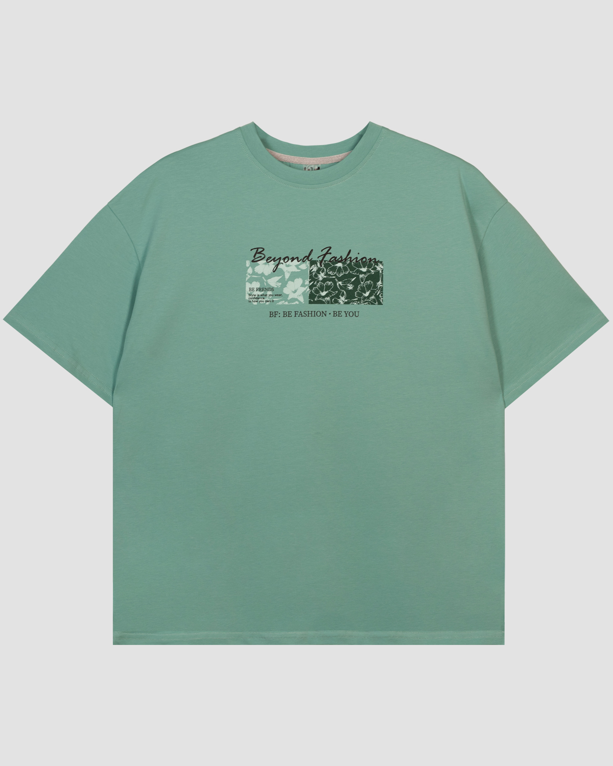 Футболка взрослая оверсайз с втачным удлиненным рукавом. Горловина круглая, обработана воротником из рибаны. Горловина спинки внутри обработана настрочной планкой из кулирки. Низ изделия и рукавов обработан швом вподгибку. Модель рассчитана на рост 176 см.