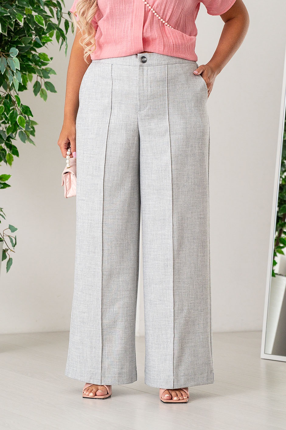 Широкие женские брюки-палаццо. Пояс отрезной в цвет изделия, выполнен из основного полотна, с эластичной тесьмой внутри. По поясу брюк отстрочка на поясной машине, нитки в цвет изделия. По центру передней половинке брюк защип с отделочной строчкой. На изделии выполнены карманы с отрезным бочком и отлетной мешковиной, вход в карман обтачной. Низ изделия обработан швом вподгибку. Модель рассчитана на рост 164-170
