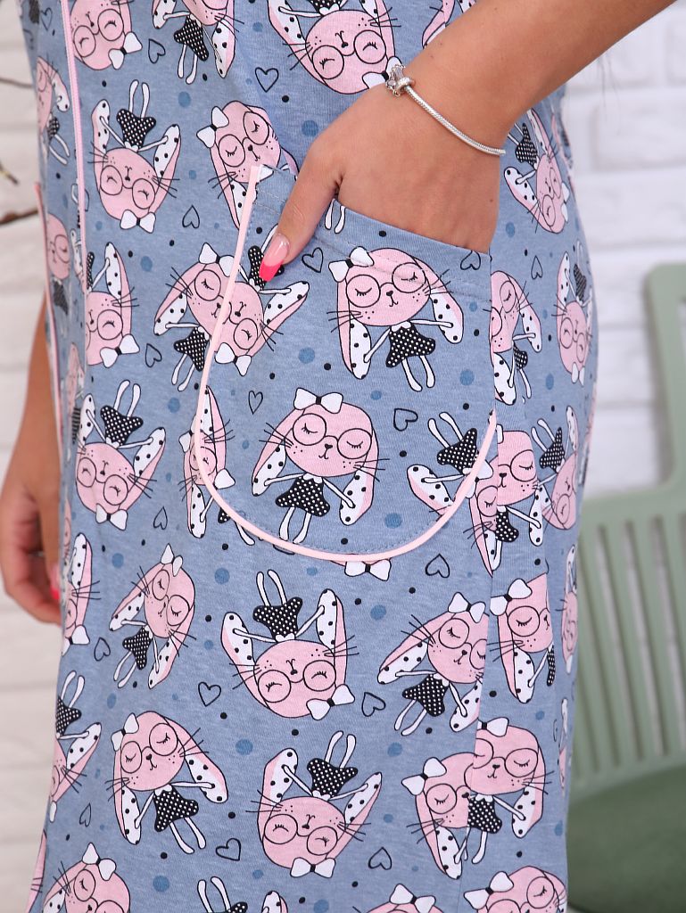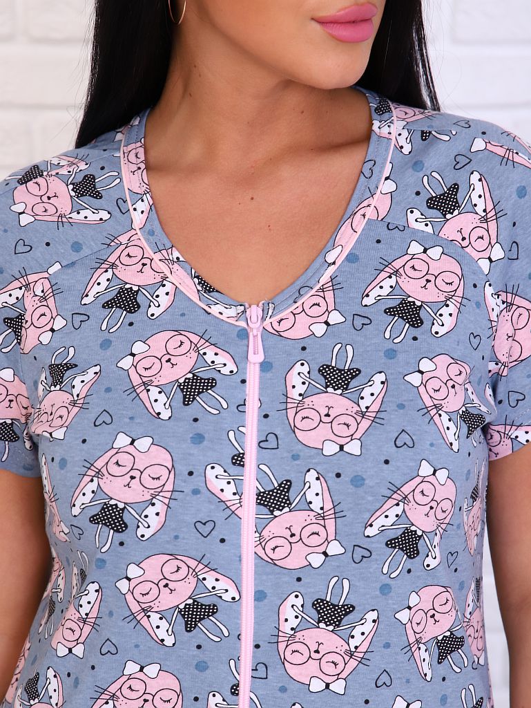 Халат молодежный из трикотажного полотна «вельмонд», прямого силуэта, с длинными втачными рукавами, капюшоном, карманами в боковых швах, и центральной бортовой застежкой на тесьму «молния». В области карманов и в верхней части левой полочки выполнена вышивка – аппликация.