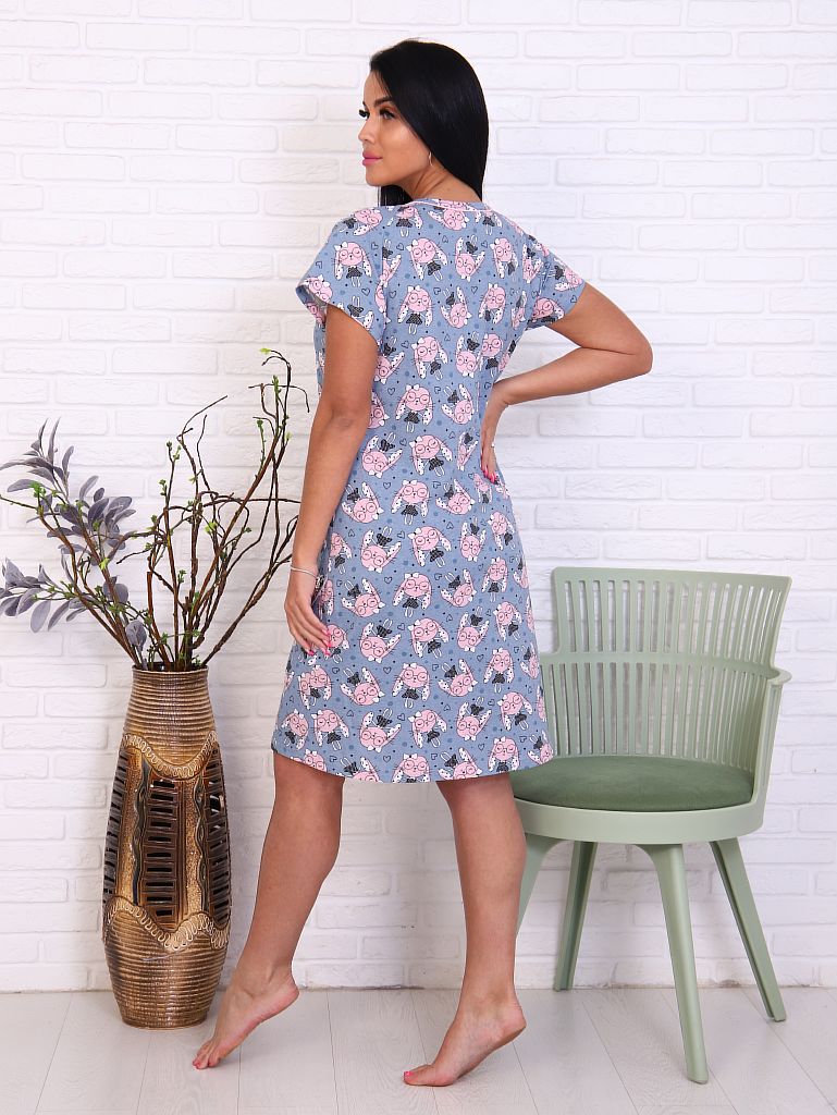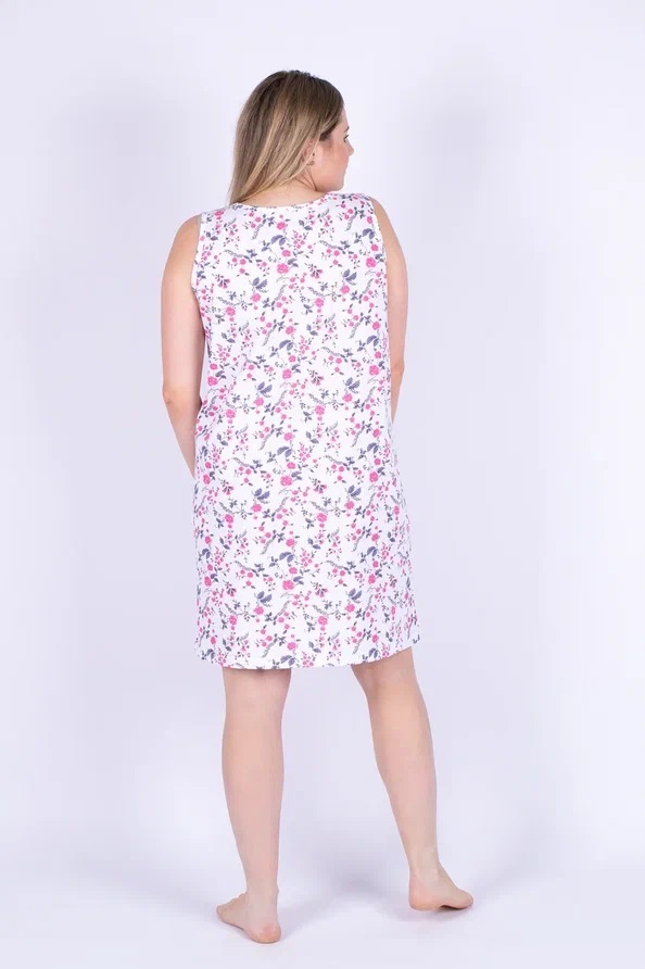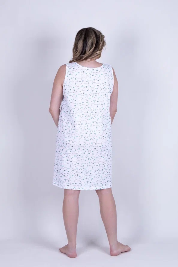Сорочка женская из трикотажного полотна «кулирка» с набивным рисунком, расширенная книзу, без рукавов, с расширенной, углубленной горловиной овальной формы и притачной кокеткой по переду. Срезы пройм и горловины, а также шов притачивания кокетки, обработаны фасонной эластичной тесьмой с кружевным краем. Низ изделия обработан узкой обметочной строчкой.