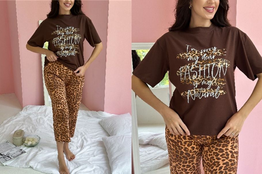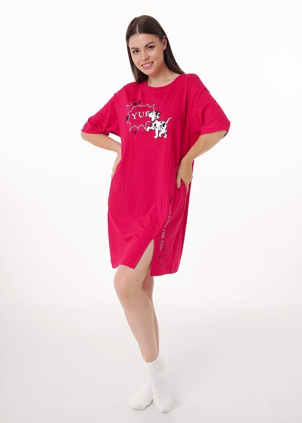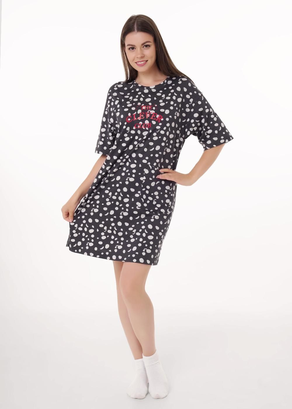 Платье для дома и отдыха из хлопкового трикотажного полотна прямого кроя. Округлая горловина с обтачкой. Короткий втачной рукав. По переду рез с разрезом .Спереди принт.