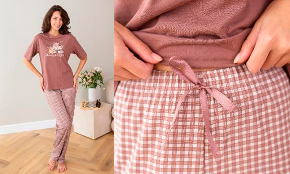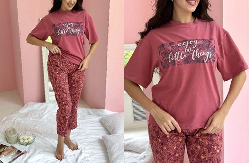 Сорочка женская из трикотажного полотна «кулирка» с набивным рисунком, свободного покроя, слегка расширенная книзу, с короткими втачными рукавами и горловиной овальной формы. Полочка – с отделочной деталью, повторяющей контур горловины, в шве притачивания которой симметрично относительно центра заложены 6 складочек-защипов. Наружный край горловины и низ рукавов обработаны узким кружевом.