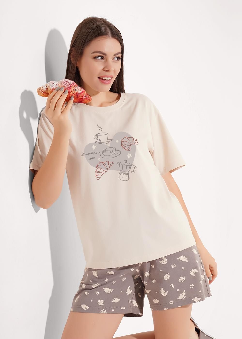 Набор одежды из хлопкового трикотажного полотна. Футболка прямого кроя. Короткий втачной рукав. Округлая горловина с обтачкой. Спереди принт. Шорты с поясом на внутренней резинке. Боковые карманы с отрезным бочком, спереди нашивка.