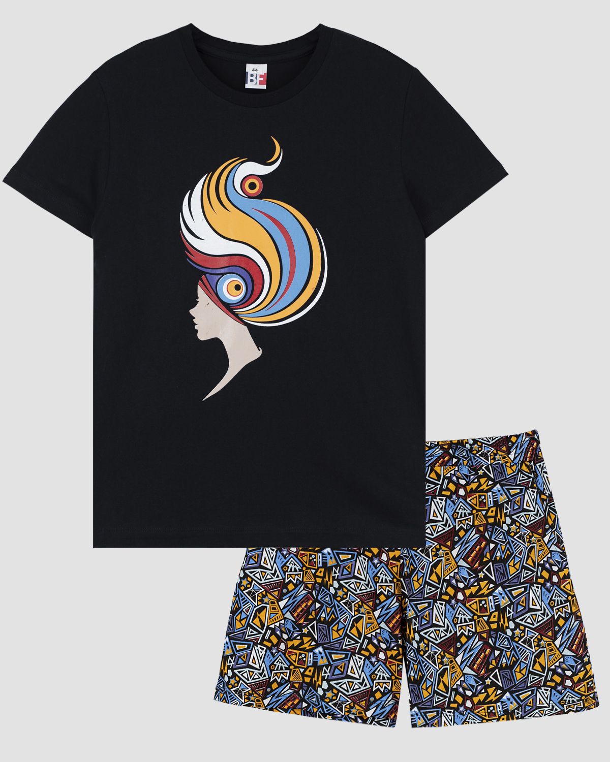 Пижама женская, состоящий из футболки и шорт. Футболка женская прямого силуэта с втачным коротким рукавом. Спинка и рукава выполнены из набивного полотна. Горловина круглая, обработана воротником из рибаны. Горловина спинки внутри обработана бейкой из основного полотна. Низ изделия и рукавов обработан швом вподгибку. На полочке принт ШЕЛКОГРАФИЯ. Шорты женские из набивного полотна. Пояс отрезной выполнен из основного полотна. На передних половинах шорт карманы с отрезным бочком. Низ шорт обработан швом в подгибку. Модель рассчитана на рост 164-170см.