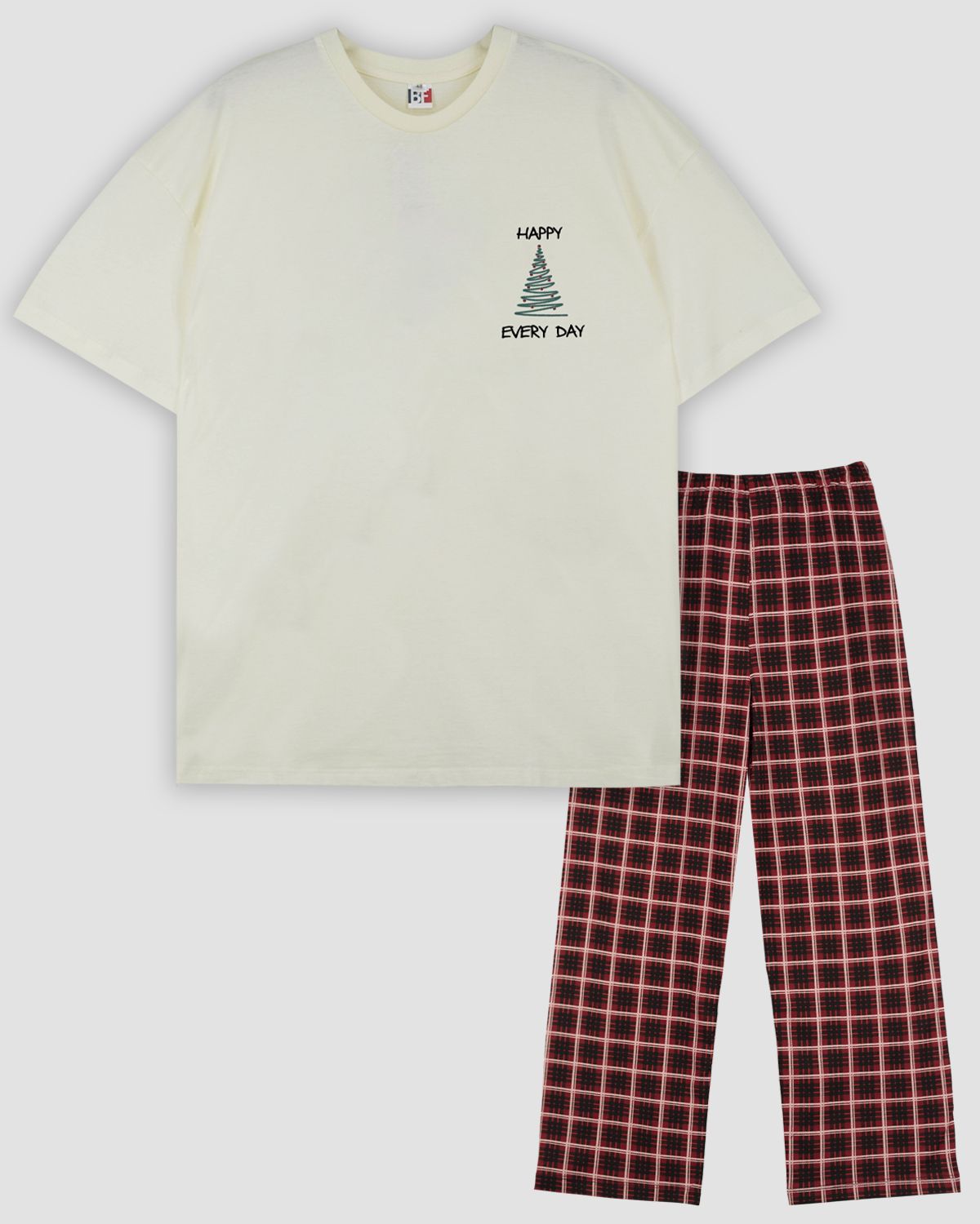 Пижама женская, состоит из футболки(оверсайз) и брюк. Футболка (оверсайз) свободного силуэта, с коротким рукавом. Горловина круглая, обработана воротником из рибаны. Горловина спинки внутри обработана бейкой из кулирки. Низ изделия и рукавов обработан швом в подгибку. На полочке ПРИНТ ШЕЛКОГРАФИЯ. Надпись переводится как "Счастье каждый день". Брюки из набивного полотна, прямого силуэта. Пояс цельнокроенный, с эластичной тесьмой внутри. Низ брюк обработан швом вподгибку. Модель рассчитана на рост 164-170см.