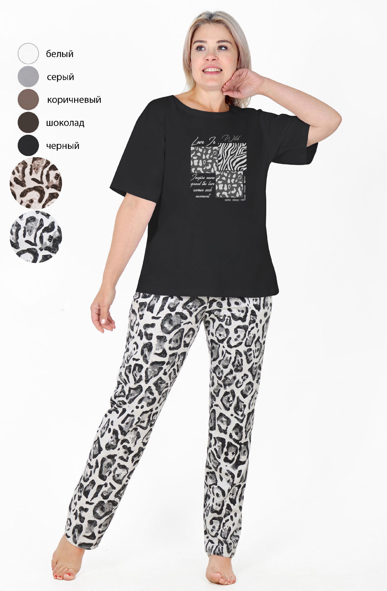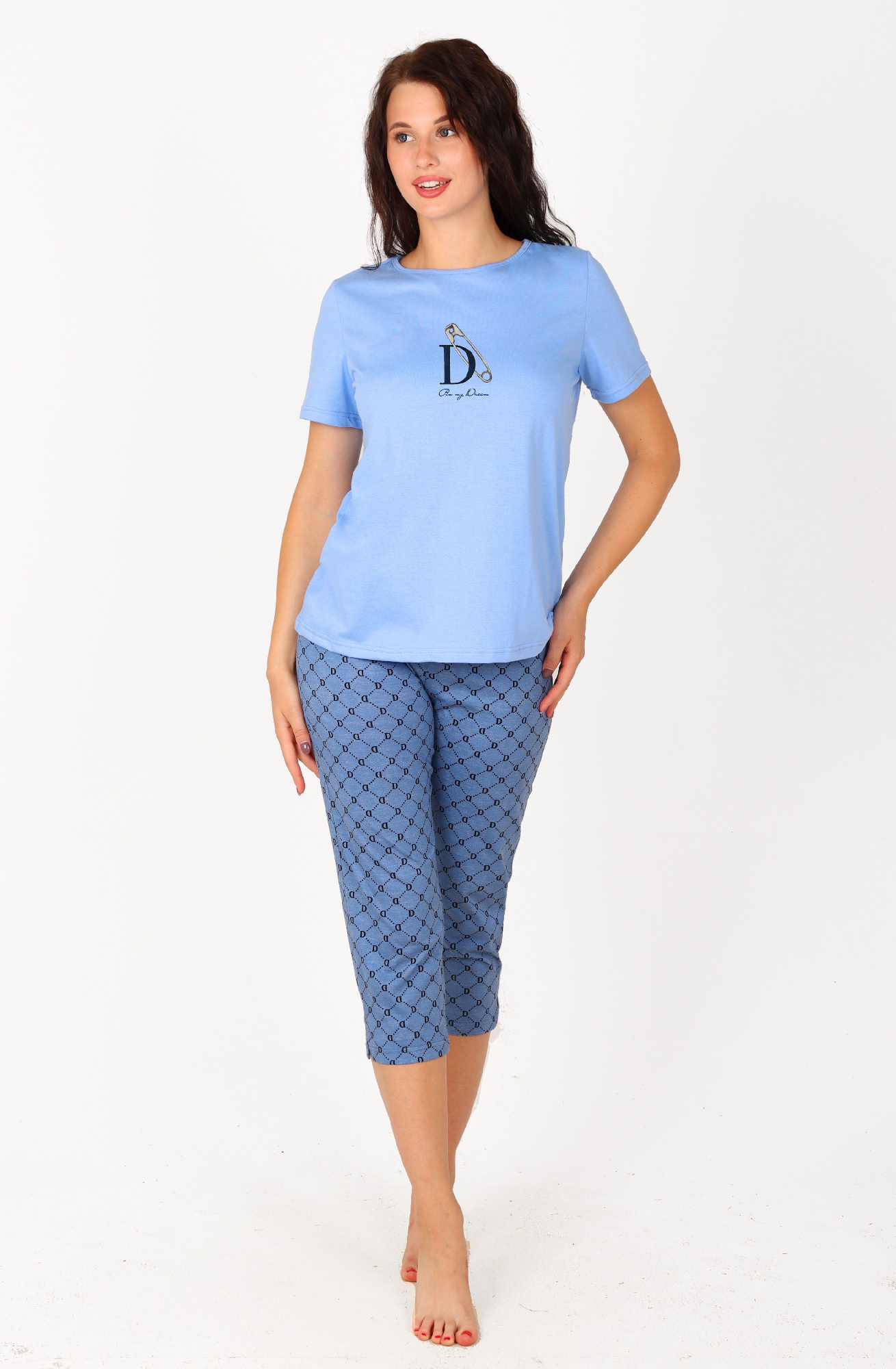 Пижама молодежная из трикотажного полотна «кулирка» в комбинации двух видов: гладкокрашеного и с набивным рисунком, состоящая из футболки и брюк. Футболка – из гладкокрашеного полотна, классического покроя, с короткими втачными рукавами, горловиной овальной формы, обработанной притачной бейкой и принтом на полочке, выполненным в технике «шелкографии».Брюки – из полотна с набивным рисунком, классического покроя, с эластичной тесьмой по талии.
