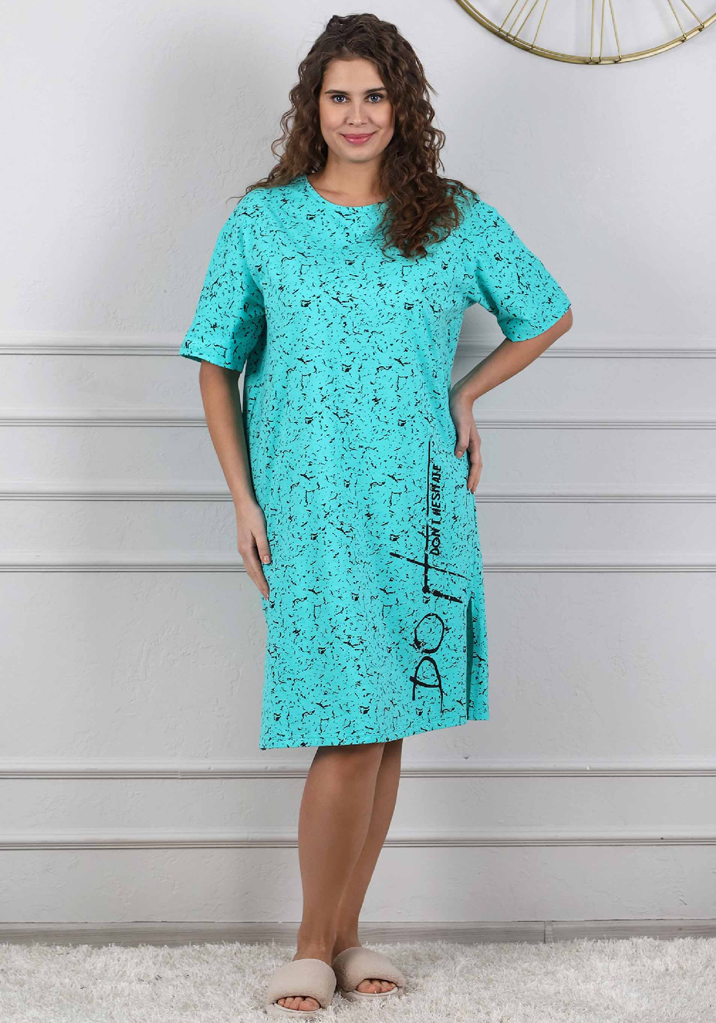 Туника женская из трикотажного полотна «кулика» с набивным рисунком, прямого силуэта, с коротким втачными рукавами, горловиной овальной формы, обработанной притачной бейкой, разрезами в боковых швах и принтом на полочке, выполненным методом шелкографии.