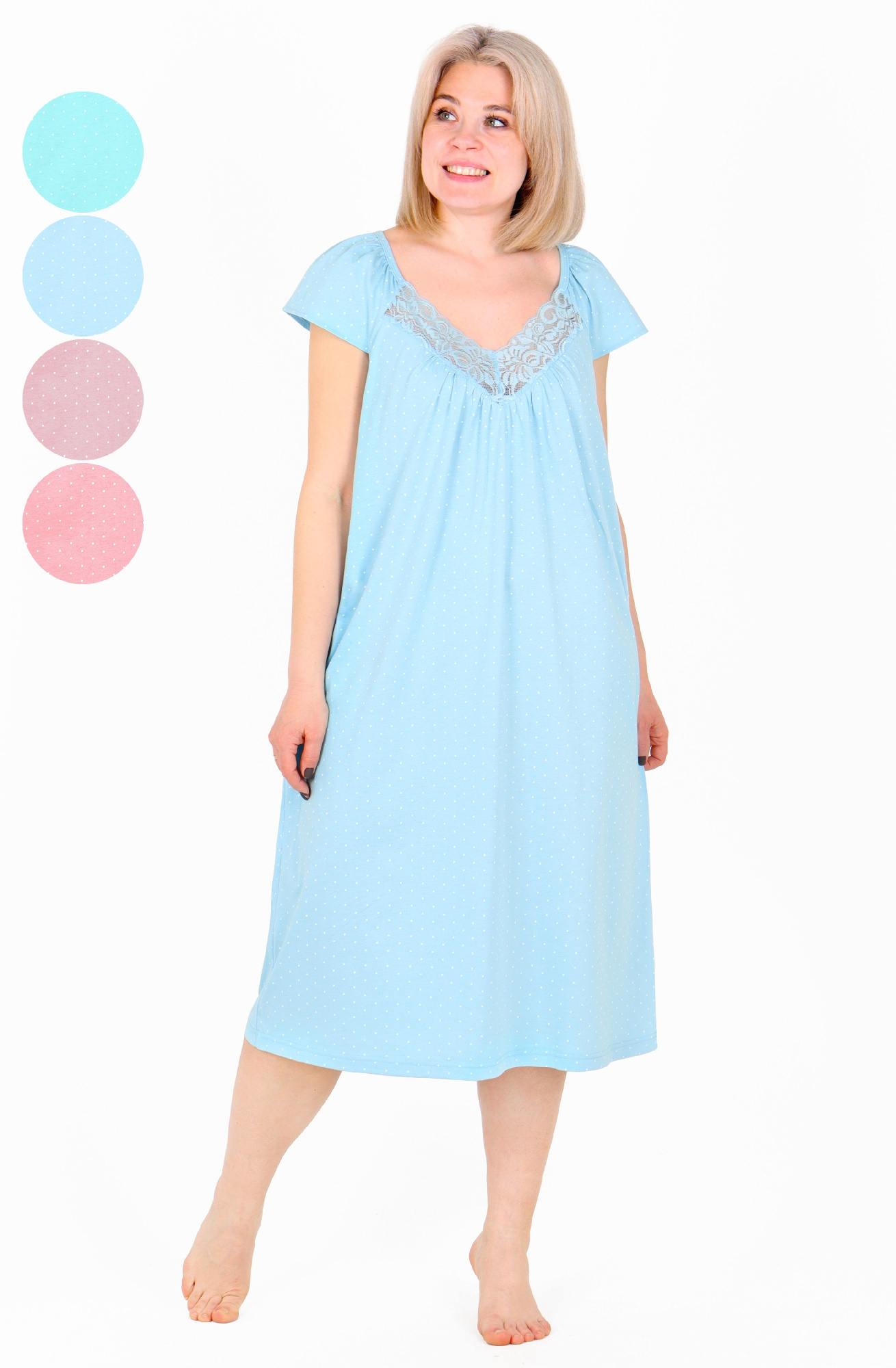 Ночная сорочка из гладкокрашеного вискозного трикотажного полотна, свободного покроя, слегка расширенная книзу, без рукавов. На полочке притачные кокетки, выполненные из кружева и образующие v-образный вырез горловины. Проймы, кружевные бретели и верхний срез спинки окантованы основным материалом.