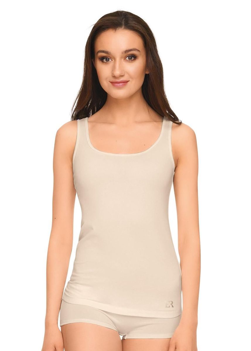 Майка женская из эластичного полотна с хлопком и модалом в составе. Широкая бретель. Круглый вырез горловины. Фирменный силиконовый логотип.