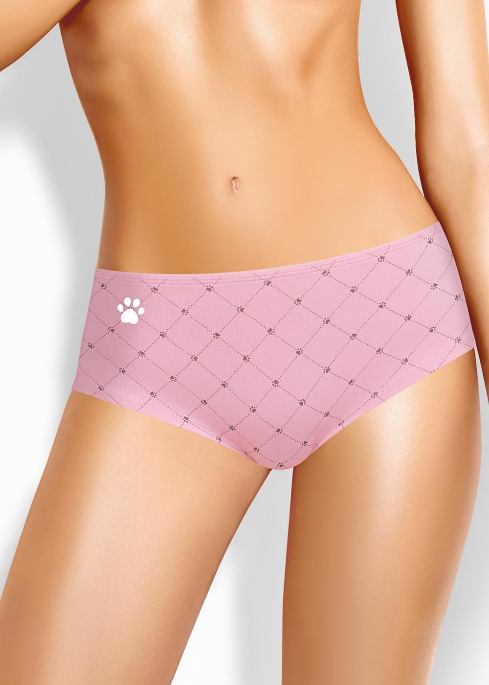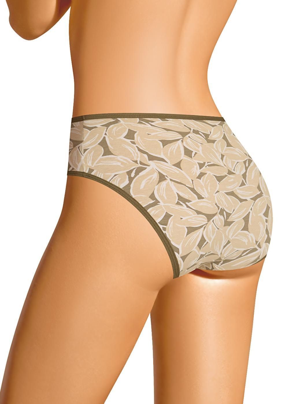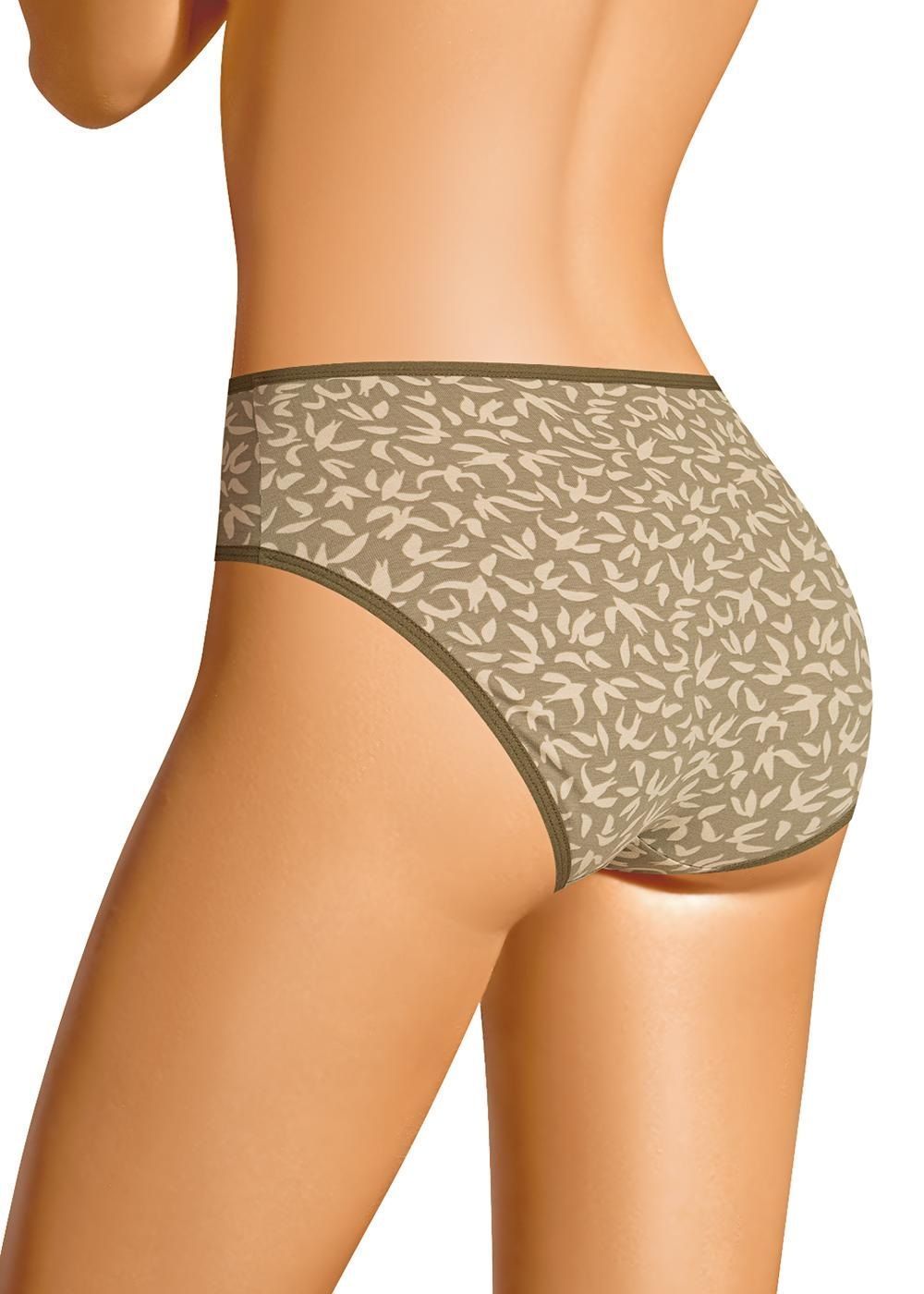 Трусы бикини женские из эластичного хлопкового полотна. Обработка краев по талии - окантовочная резинка, по ноге - полуокантовка. Спереди пуговица, принт.