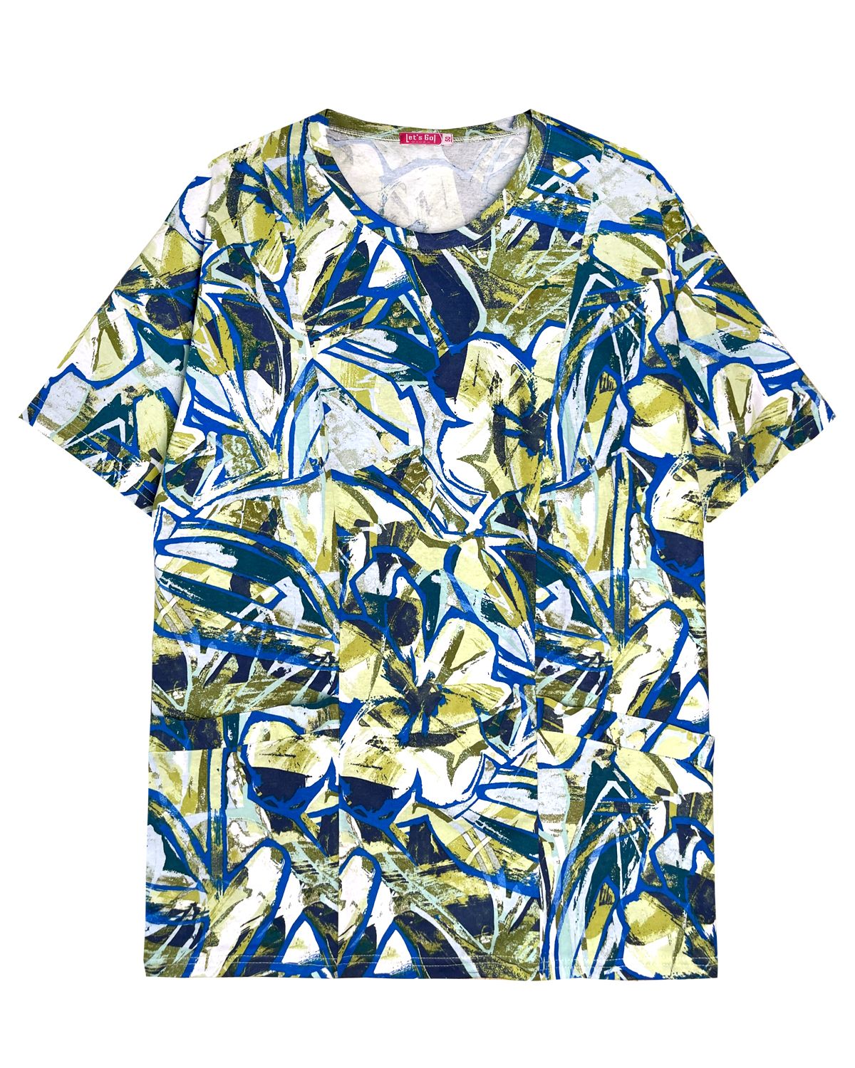 Футболка свободного силуэта из набивного полотна со спущенным плечом коротким рукавом и накладными карманами. Горловина круглая, обработана обтачкой из основного полотна. На передней полочке рельефыи накладные карманы с обтачкой. Низ изделия и рукавов обработан швом вподгибку. Модель рассчитана на рост 164-170см.