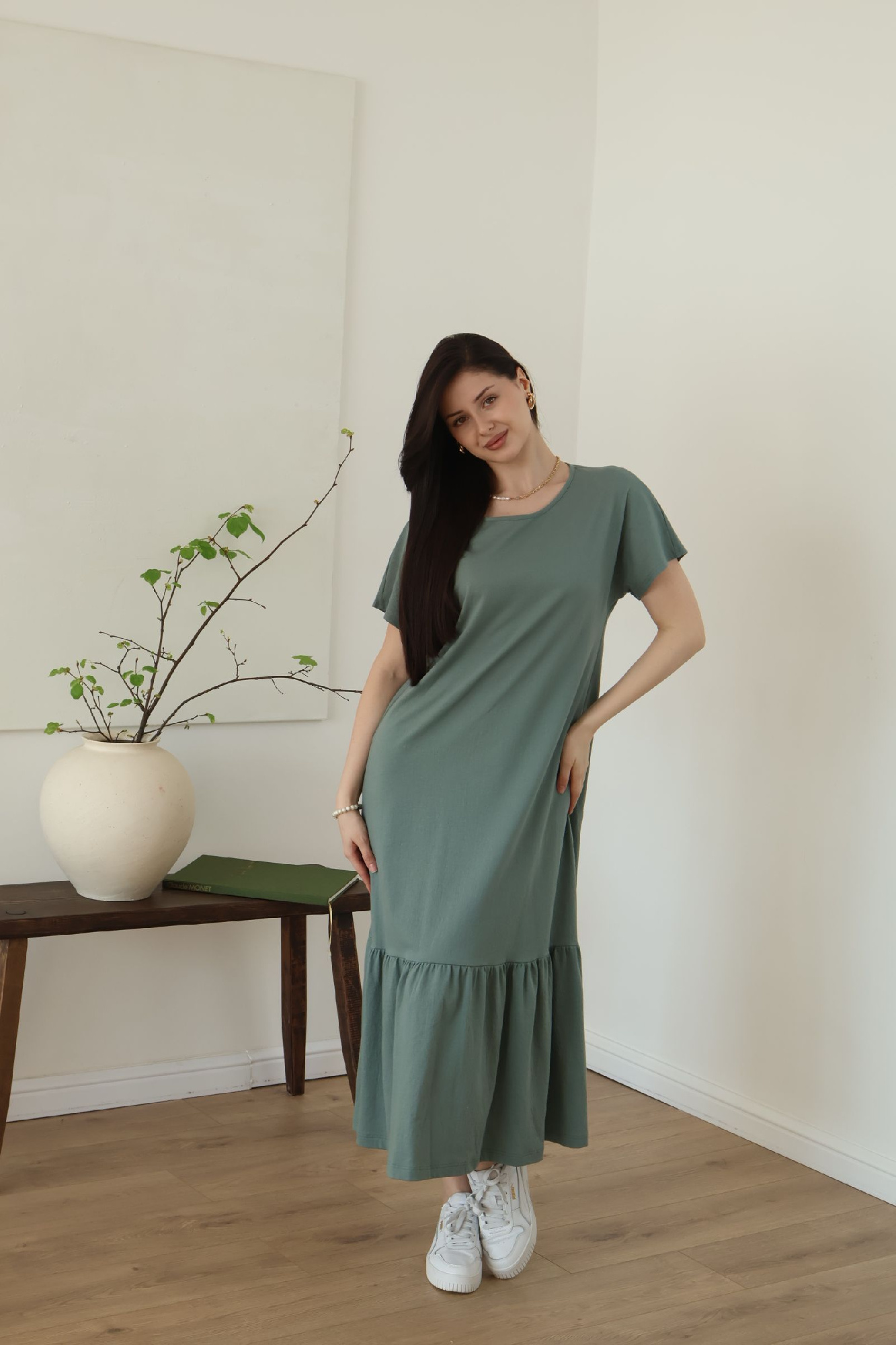 Футболка женская прямого силуэта с втачным коротким рукавом. Горловина V-образная, обработана воротником из основного полотна, в цвет изделия. Горловина спинки внутри обработана бейкой из кулирки. По горловине полочки отделочная строчка. Низ изделия и рукавов обработан швом вподгибку. Модель рассчитана на рост 164-170.