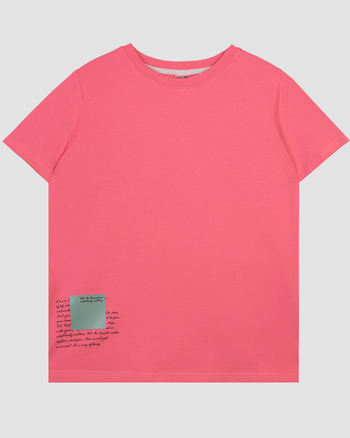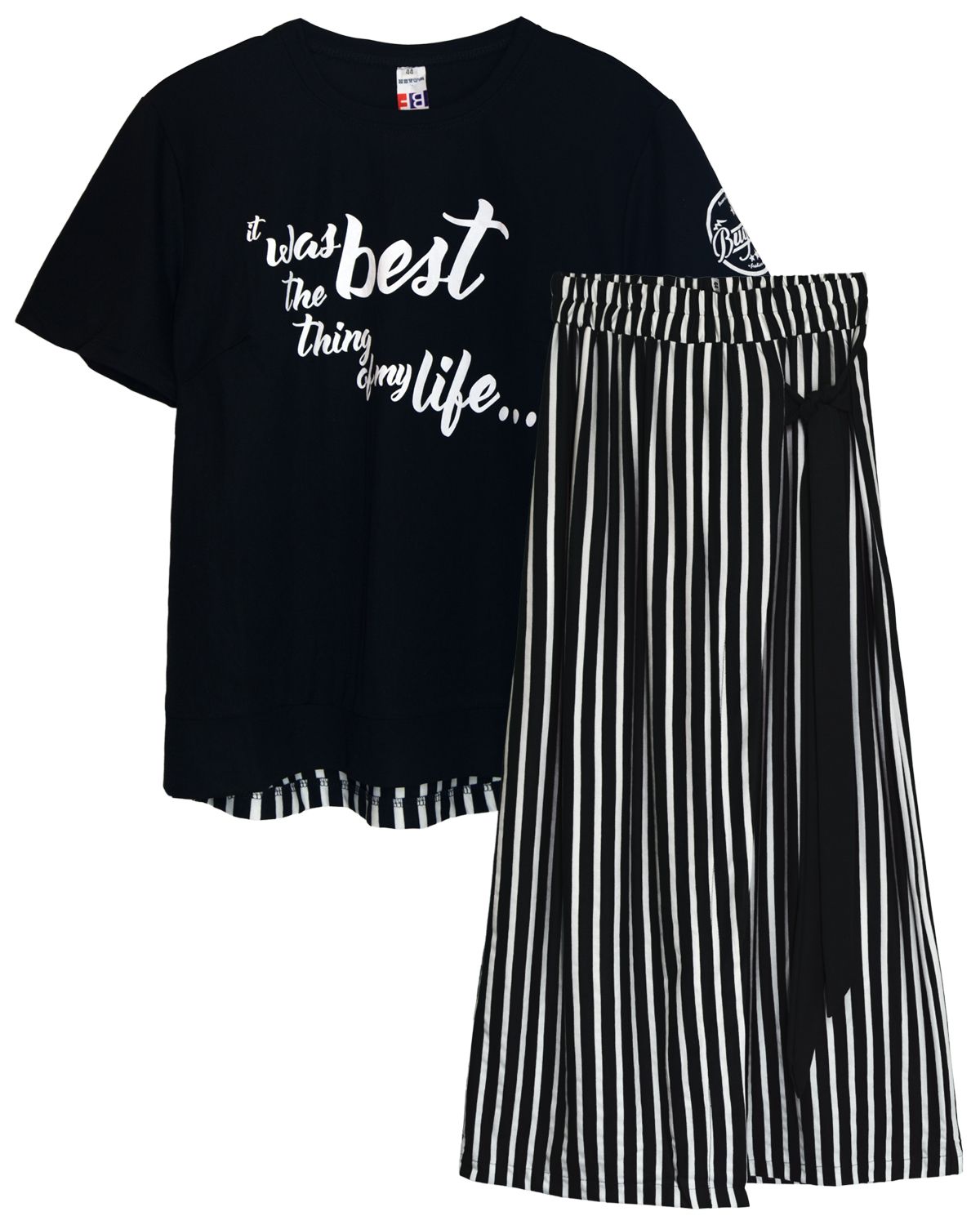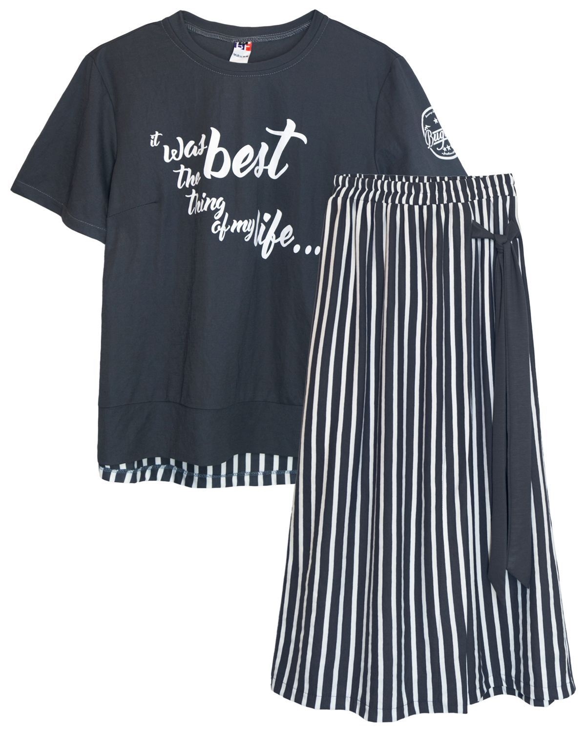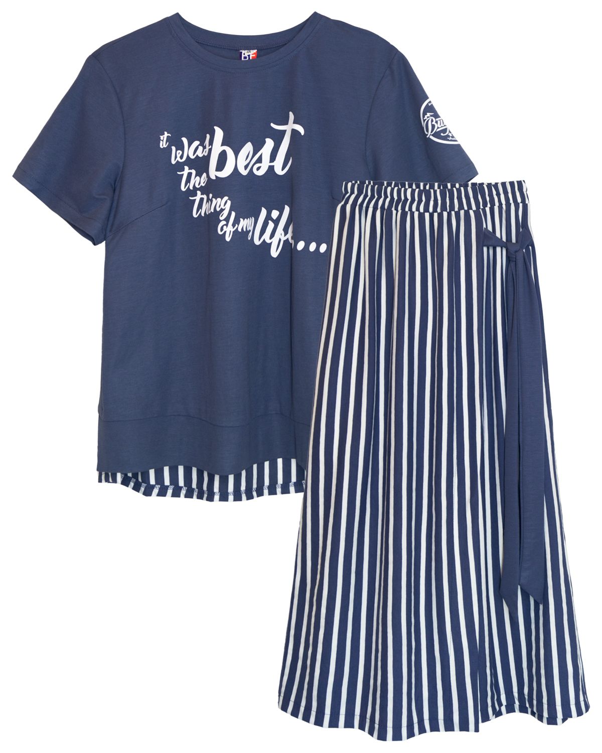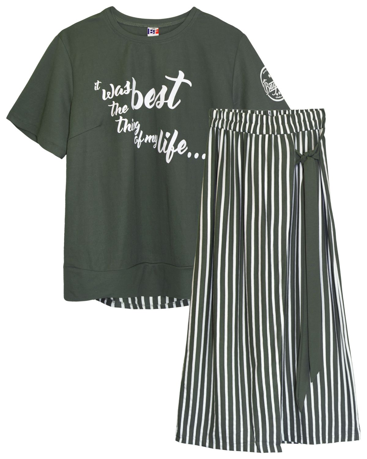 Комплект женский свободного кроя, состоящий из футболки и брюк. Женская футболка с круглым вырезом горловины, прямого силуэта с втачным коротким рукавом. На полочке принт шелкография. На спинке верхняя часть из однотонного полотна, нижняя часть из набивного полотна Брюки из набивного полотна, силуэт палаццо. На брюках съемный пояс из однотонного полотна. Модель расчитана на рост 164-170.