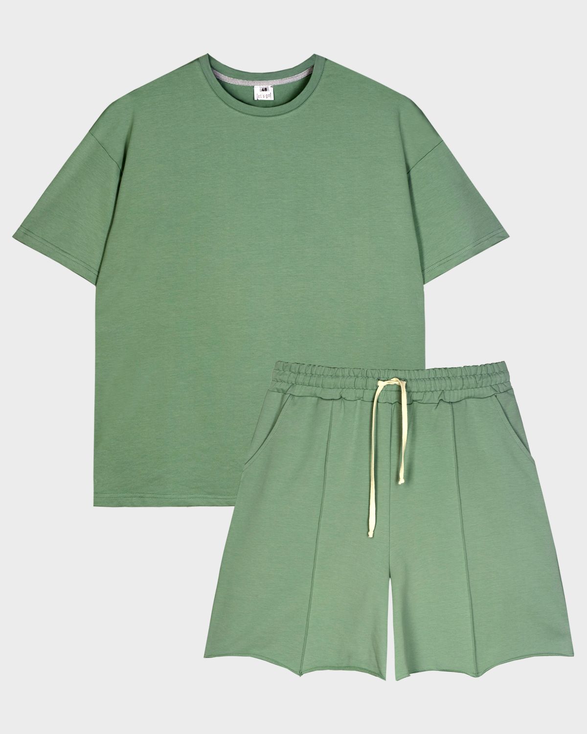 Комплект женский, состоящий из футболки и шорт. Футболка женская (оверсайз) свободного силуэта, с коротким рукавом. Горловина круглая. Низ изделия и рукавов обработан швом вподгибку.Шорты женские трапециевидного силуэта. Пояс отрезной в цвет изделия, выполнен из основного полотна, с эластичной тесьмой внутри. По поясу шорт вставлен плоский утягивающий шнурок, цвет серый меланж, низ шнурка подвернут и застрочен. Вдоль пояса шнурок закреплен отстрочкой на поясной машине. По центру передней и задней половинке шорт защип. На изделии выполнены карманы с отрезным бочком и отлетной мешковиной, вход в карман обтачной. Низ изделия не обработанный край. Модель рассчитана на рост 164-170