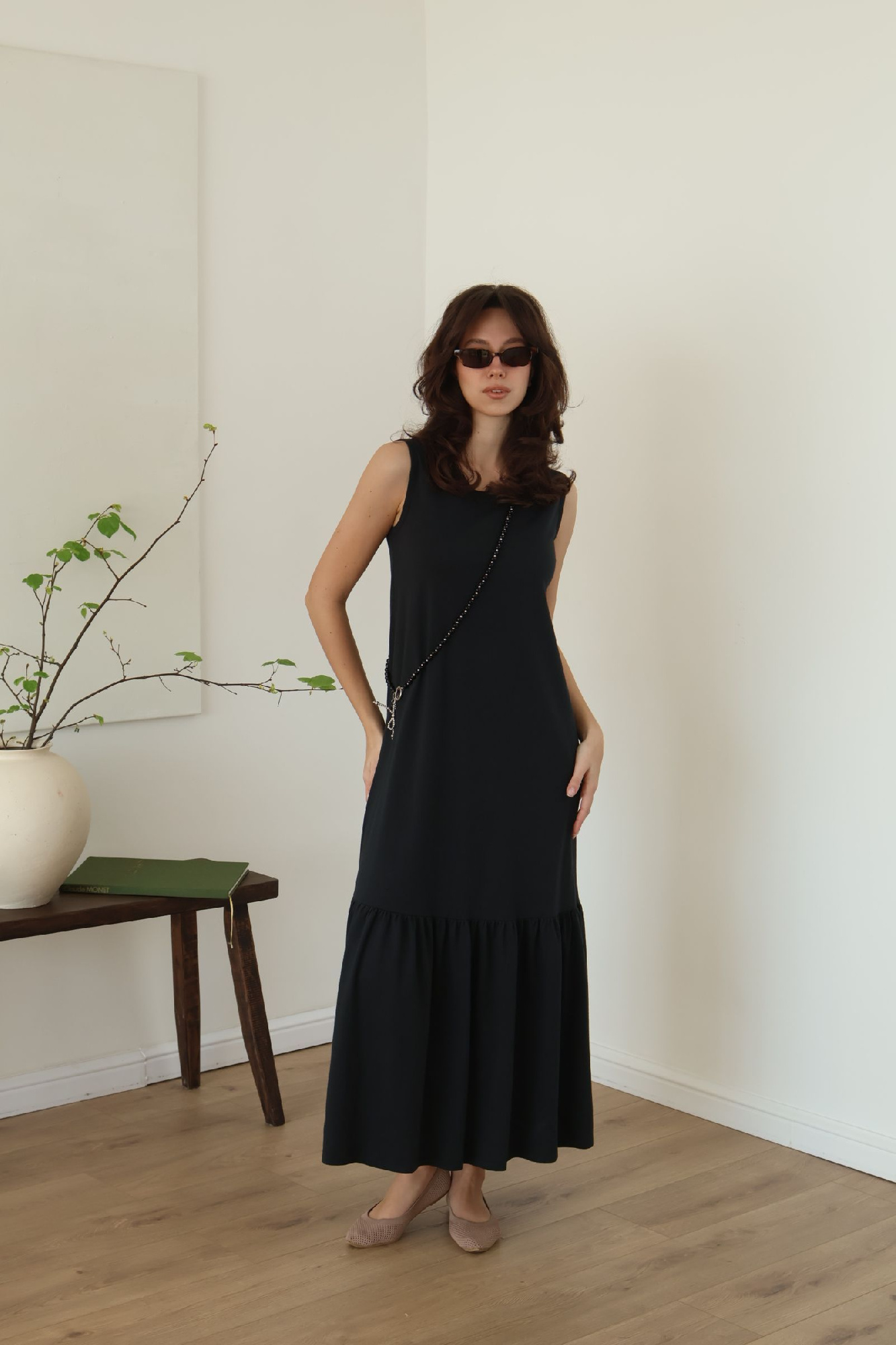 Майка женская на одно плечо, прилегающего силуэта (до линии бедра). Пройма и горловина круглые, обработаны бейкой из кашкорсе (ширина бейки в готовом виде 1,6 см), нитками в цвет изделия. Низ майки обработан швом вподгибку. Модель рассчитана на рост 164-170