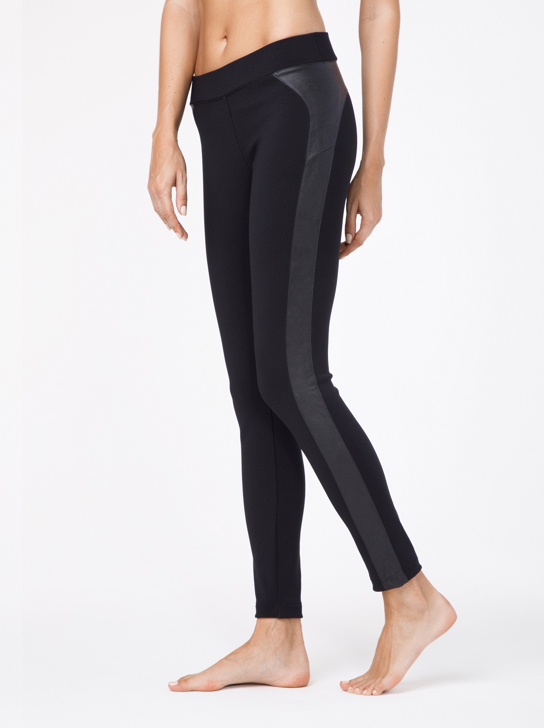 Легинсы женские из трикотажного полотна с кокеткой и боковой вставкой из кож. заменителя. Пояс притачной с широкой эластичной тесьмой внутри. По швам притачивания боковых вставок, кокетки, пояса, средним швам передних и задних половинок выполнена одинарная узкая отделочная строчка.