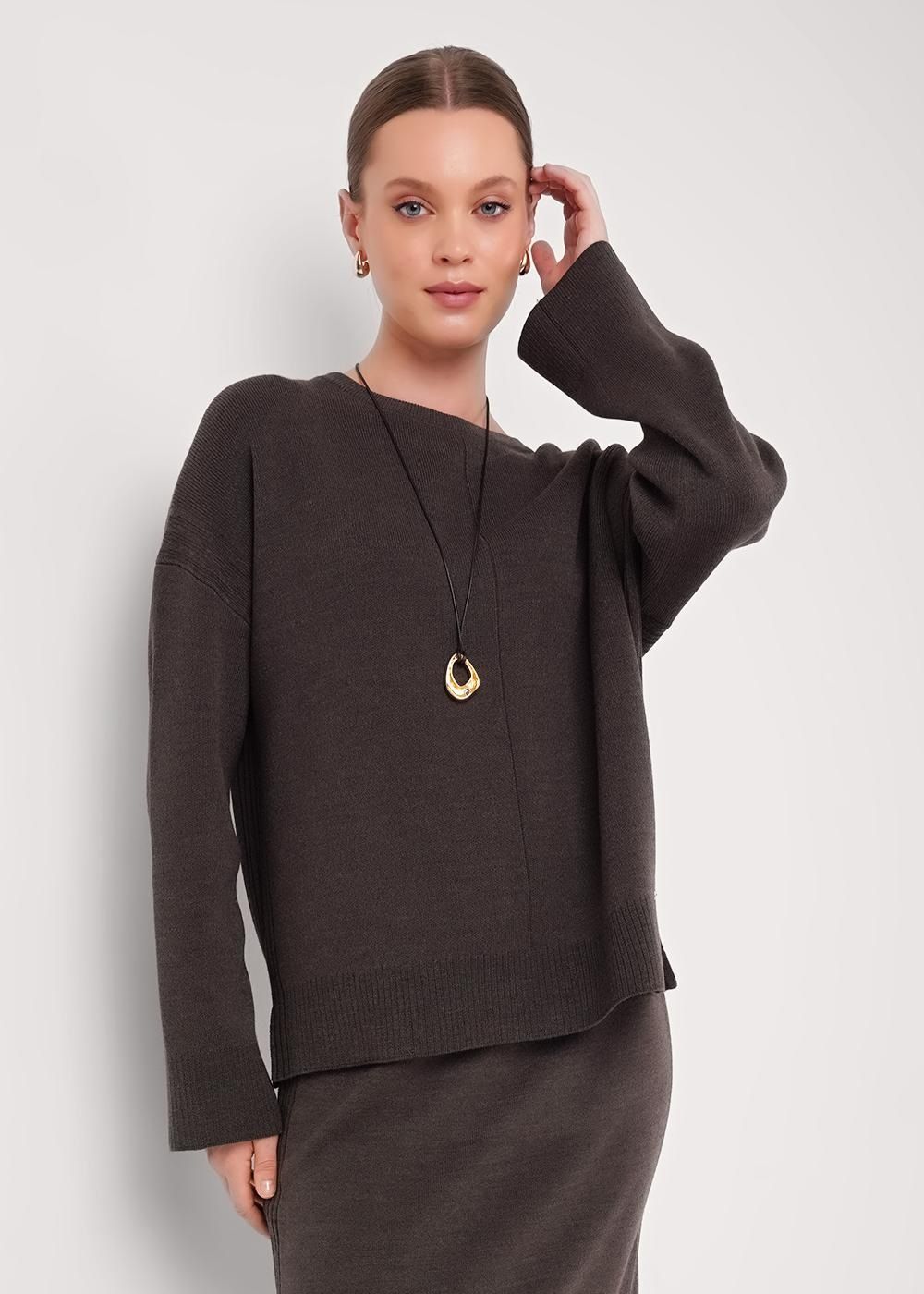 Вязаный джемпер из акриловой пряжи, переплетение гладь,свободного силуэта.Округлая горловина с бейкой. Длинный рукав со спущенной линией плеча.Вертикальные полосы сбоку и пройме. По низу изделия и рукавов широкие манжеты. Боковые разрезы, нашивка металл.