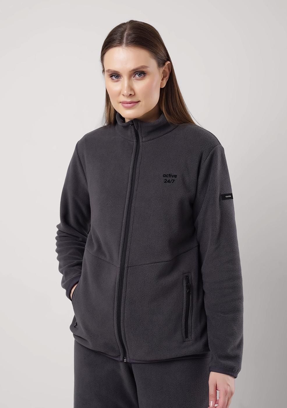 Куртка спортивная прямого силуэта из трикотажного полотна флис, на молнии. По горловине стойка. Спереди горизонтальный рез, карманы на молнии. Длинный рукав со спущенной линией плеча, нашивка.По низу рукава и низа изделия окантовка. Спереди вышивка.