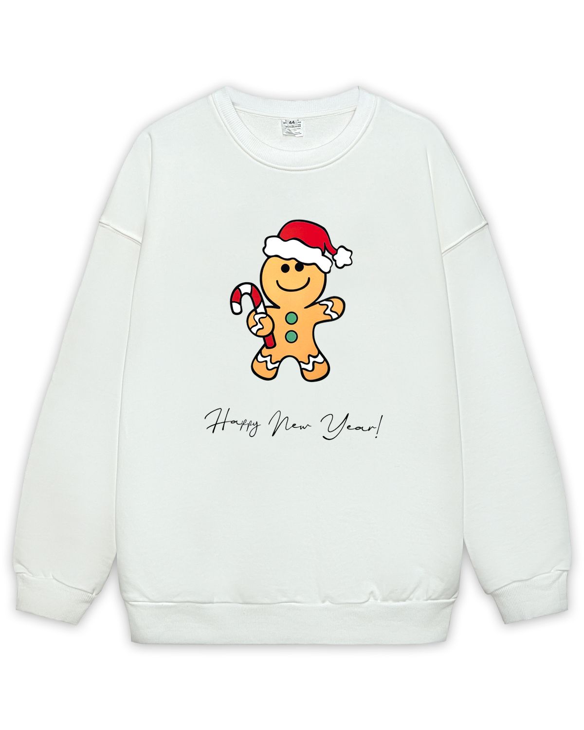 Джемпер взрослый, свободного кроя со спущенной линией плеча и длинным рукавом. Горловина круглая, обработана обтачкой из кашкорсе. По пройме и рукаву отделочная строчка на плоскошовной машине, припуск смотрит на полочку и спинку. Низ рукава и низ изделия заканчивается манжетом из кашкорсе. На полочке принт DTF.