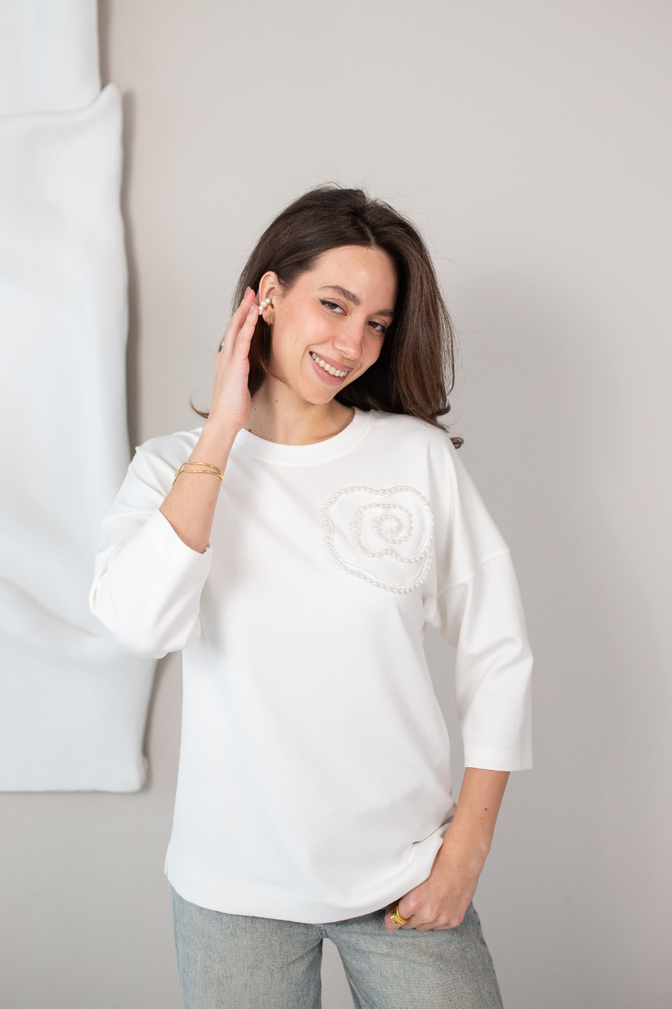 Джемпер свободного кроя из трикотажного полотна плотное пике. Короткий рукав со спущенной линией плеча. По переду рельефы. Округлая горловина с вязаной обтачкой. По низу изделия притачной манжет с кулисой и вязаным шнуром. Спереди принт с вышивкой.