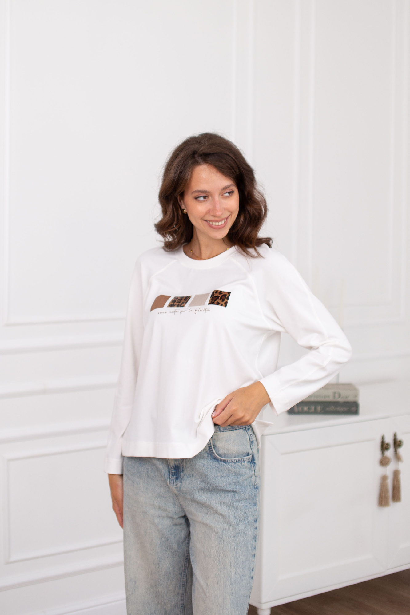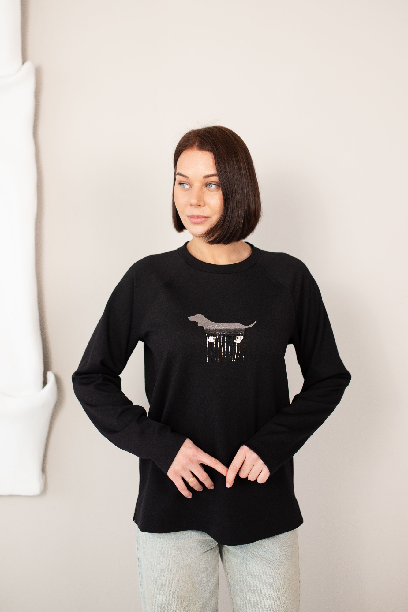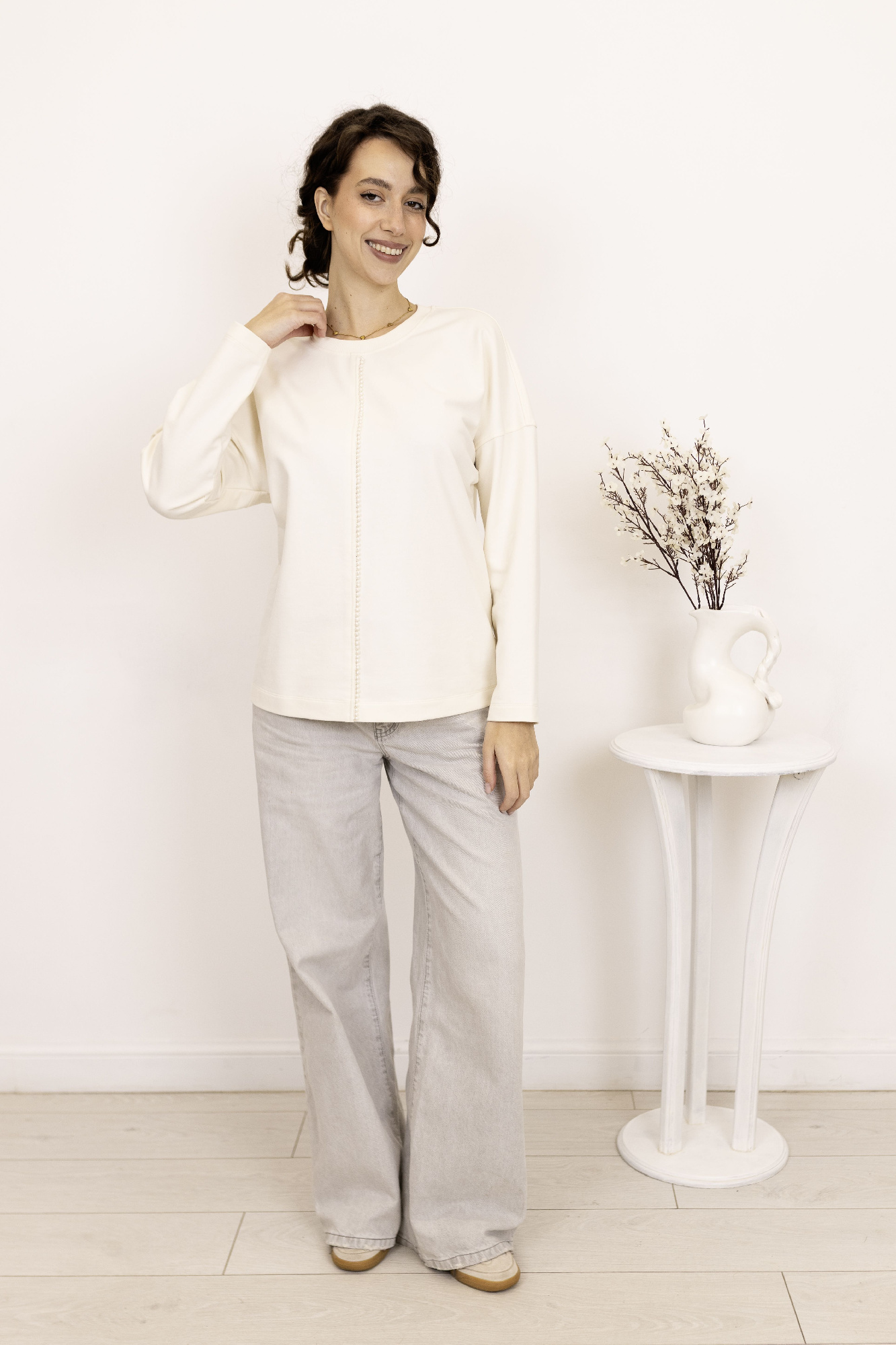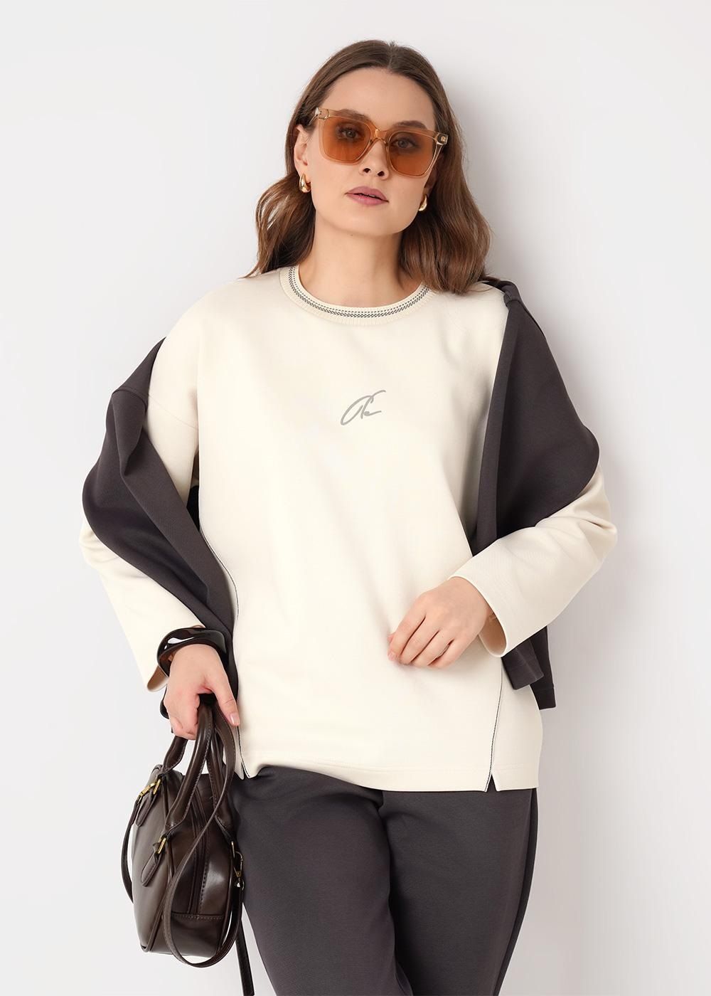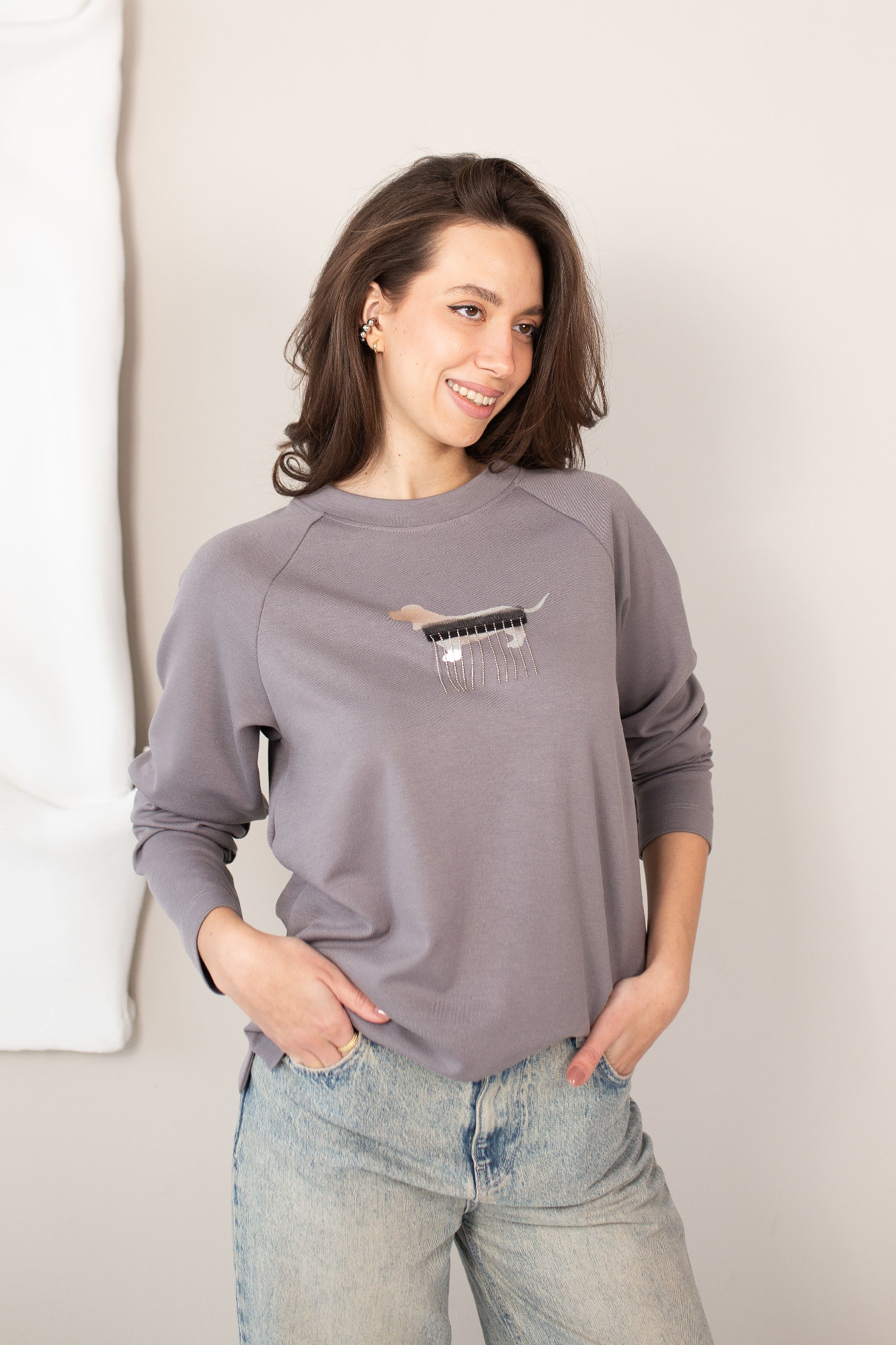 Джемпер свободного объема из трикотажного полотна плотное пике. Округлая горловина с вязаной обтачкой. Длинный рукав со спущенной линией плеча. По переду рельефы с декоративной тесьмой люрекс, внизу разрезы. По спинке средний шов. Спереди принт.