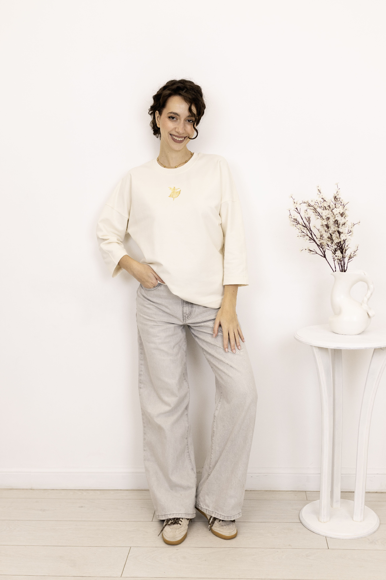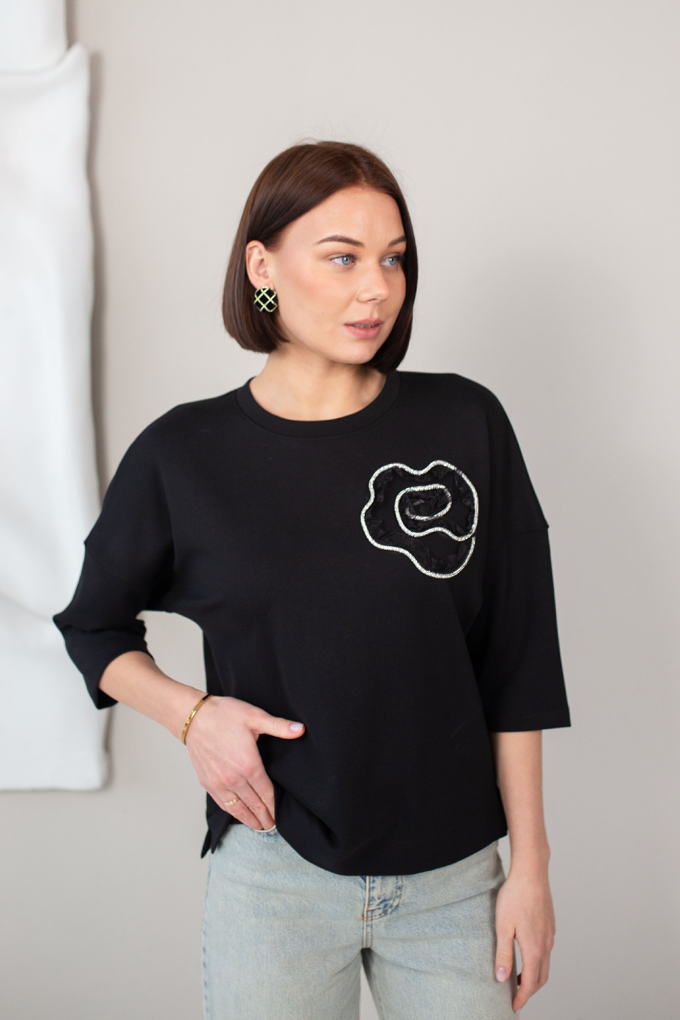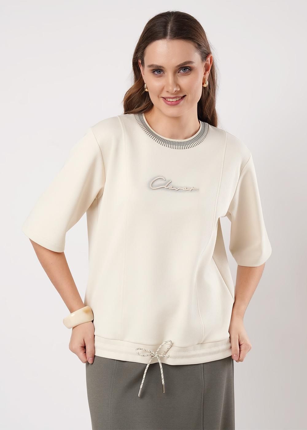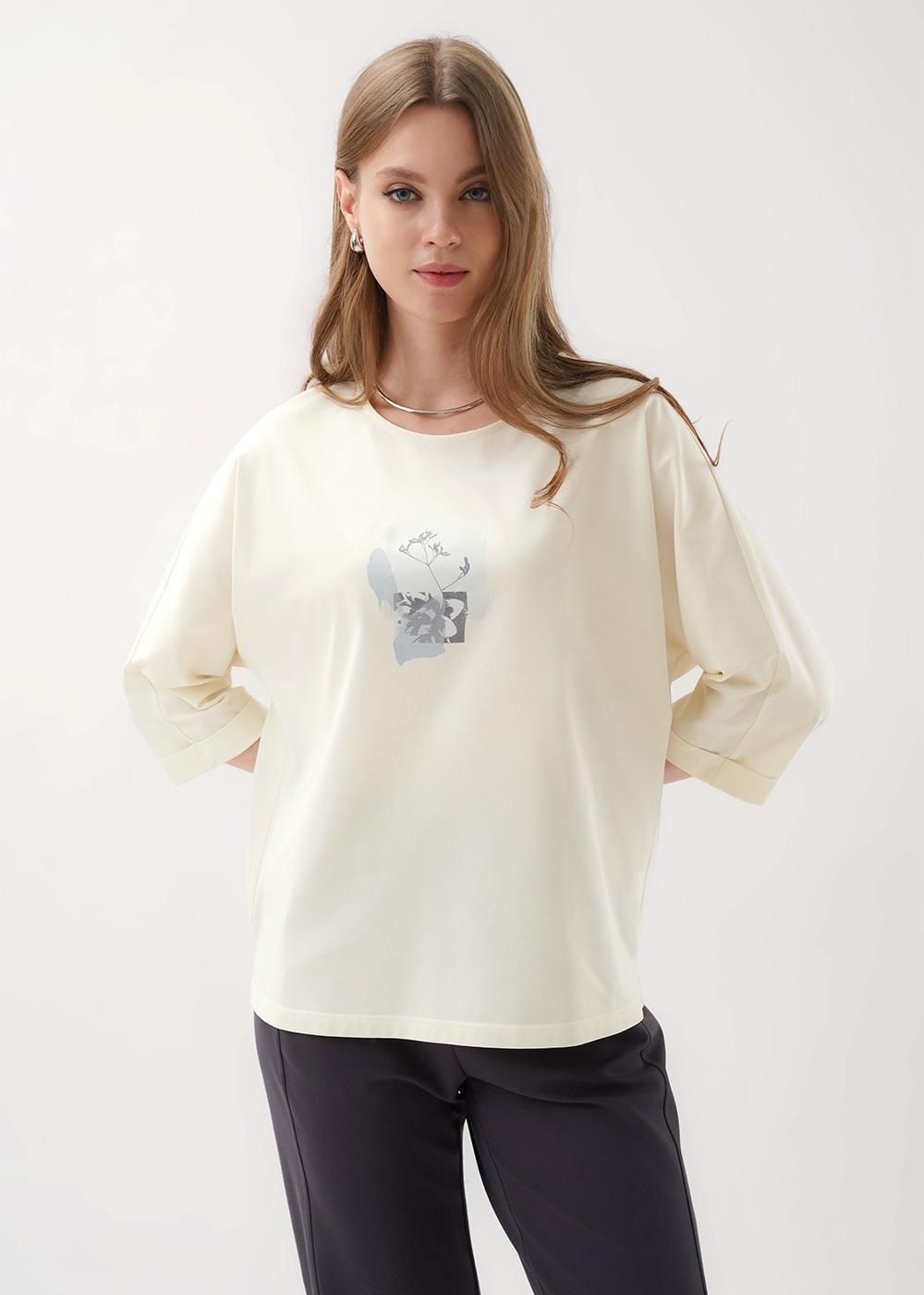 Джемпер свободного объема из трикотажного полотна. Округлая горловина с обтачкой из кашкорсе. Короткий цельнокроеный рукав, по низу манжет. По спинке кокетка со складкой. По низу изделия манжет. Спереди принт с вышивкой.