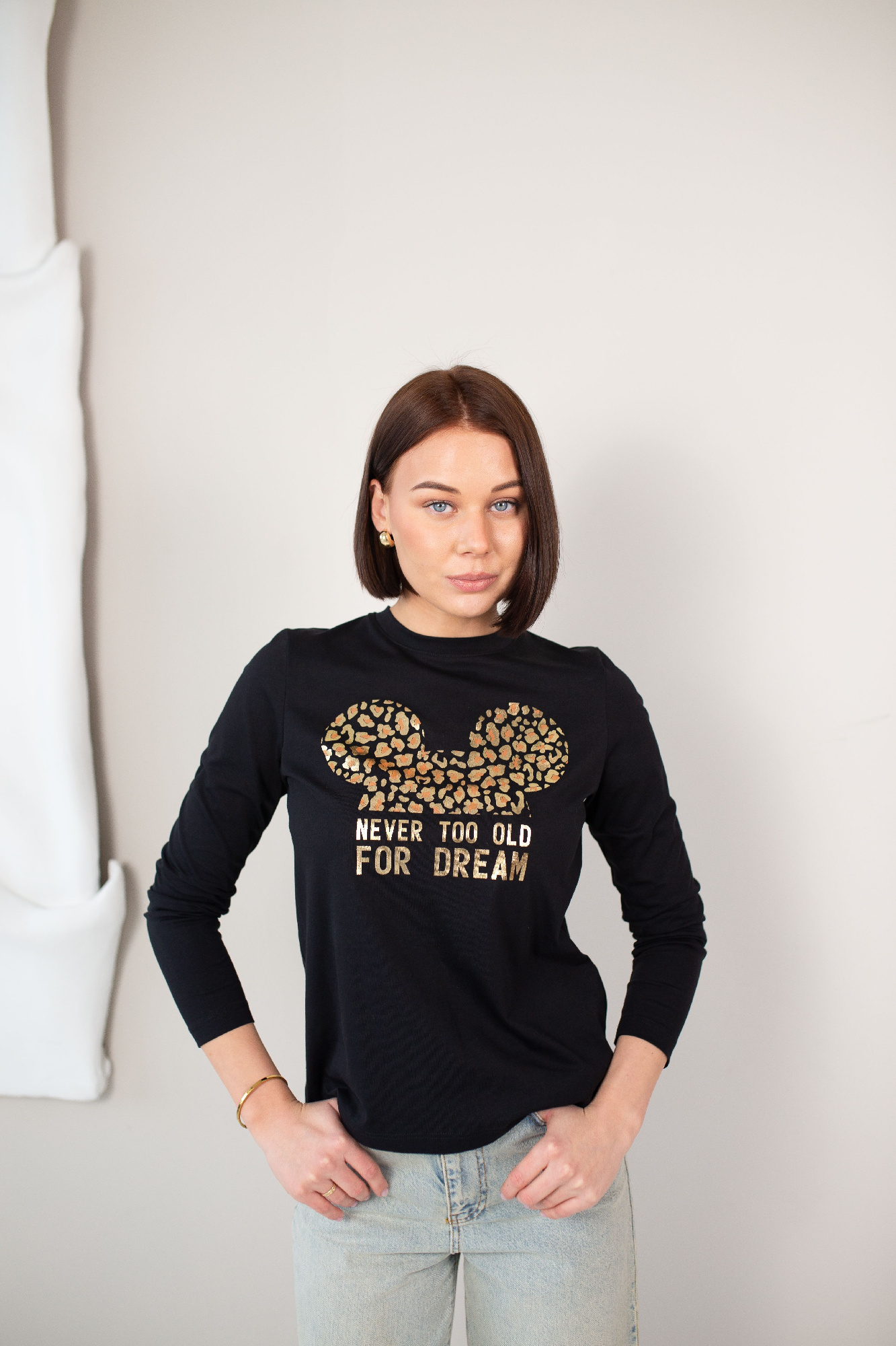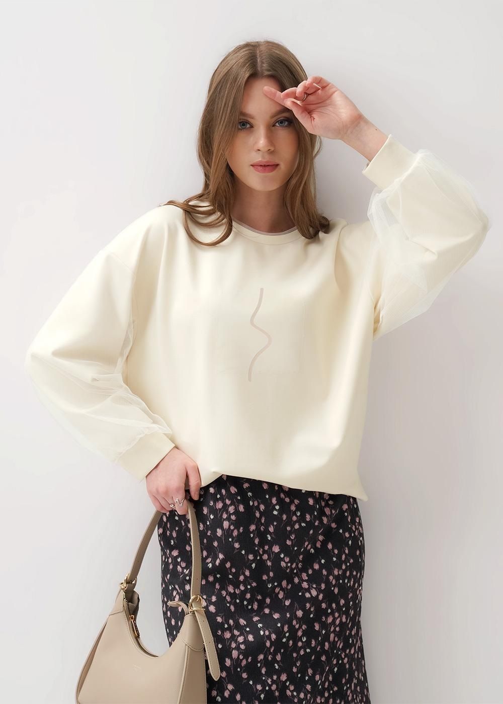Джемпер свободного объема из трикотажного полотна дабл фейс. По горловине обтачка с сеткой. Длинный рукав со спущенной линией плеча. Рукав дублирован сеткой, внизу присборен. По низу рукава и изделия притачной манжет. Спереди принт пленка.