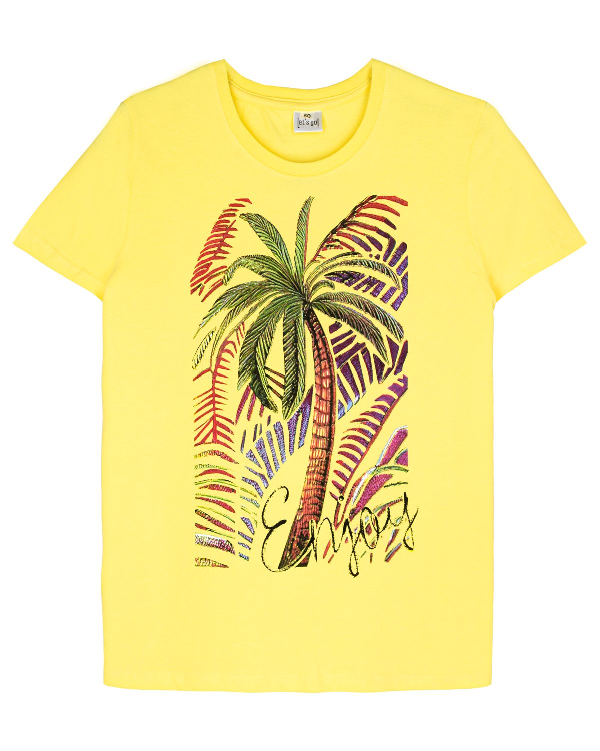 Футболка женская прямого силуэта с втачным коротким рукавом. Горловина круглая, обработана воротником из рибаны. Горловина спинки внутри обработана бейкой из кулирки. По горловине полочки отделочная строчка. Низ изделия и рукавов обработан швом вподгибку. На полочке Фотопринт. Надпись переводится как "Наслаждение". Модель рассчитана на рост 164-170см.