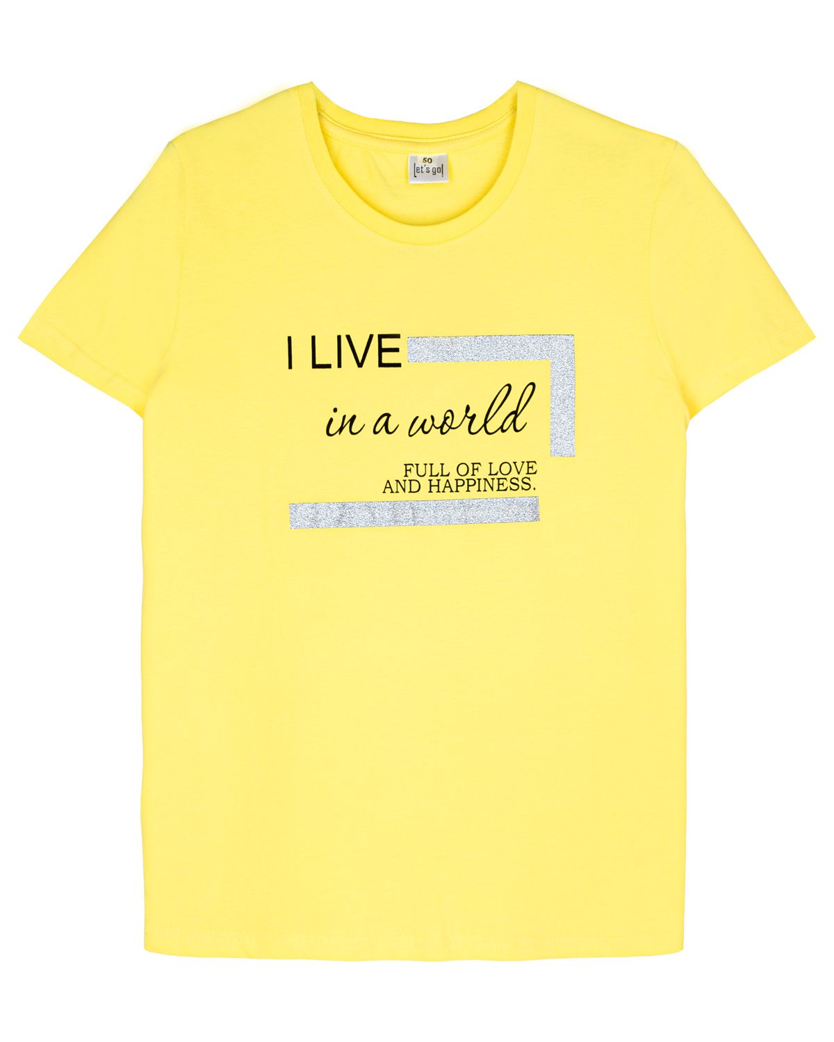Футболка женская прямого силуэта с втачным коротким рукавом. Горловина круглая, обработана воротником из рибаны. Горловина спинки внутри обработана бейкой из кулирки. По горловине полочки отделочная строчка. Низ изделия и рукавов обработан швом вподгибку. На полочке принт Шелкография с глиттером. Надпись переводится как "Я живу в мире полном любви и счастья". Модель рассчитана на рост 164-170см.