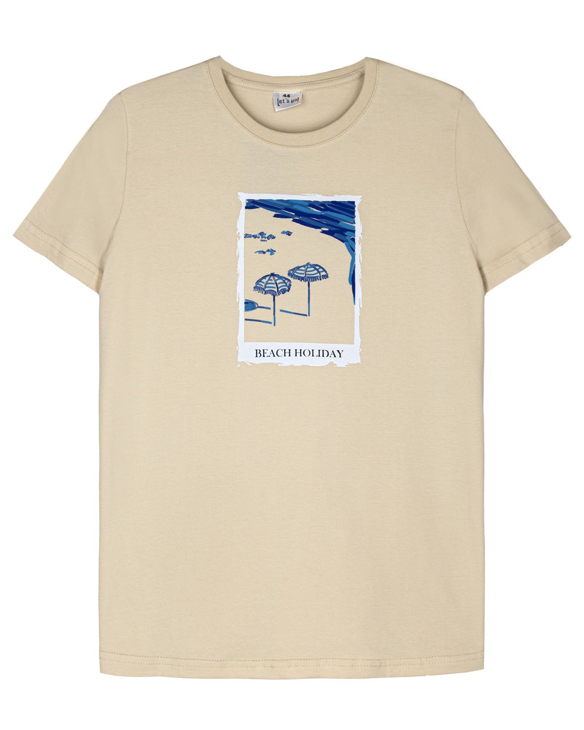 Футболка женская прямого силуэта с втачным коротким рукавом. Горловина круглая, обработана воротником из рибаны. Горловина спинки внутри обработана бейкой из кулирки. По горловине полочки отделочная строчка. Низ изделия и рукавов обработан швом вподгибку. На полочке принт Шелкография. Надпись переводится как "Пляжный отдых". Модель рассчитана на рост 164-170см.