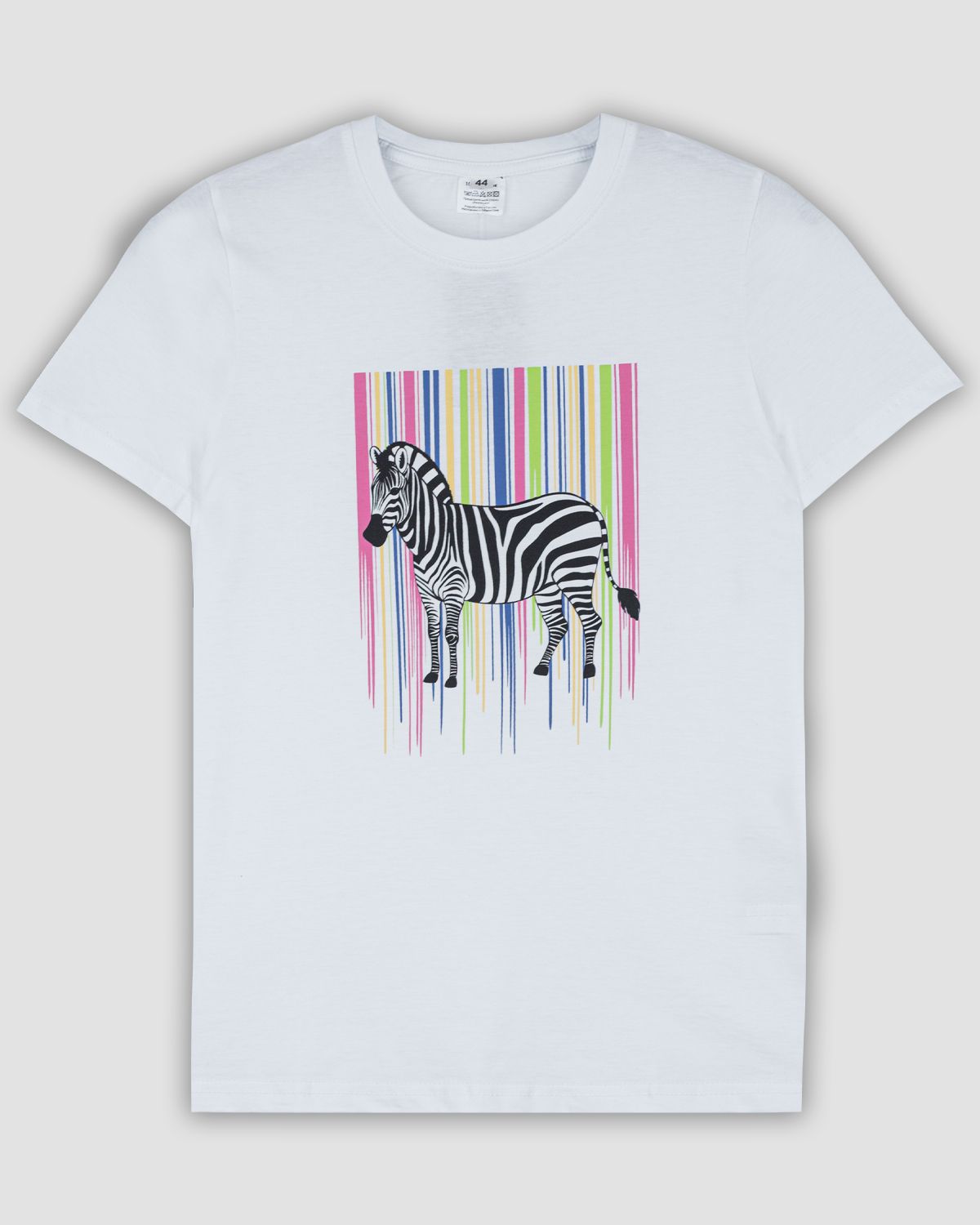 Футболка женская прямого силуэта с втачным коротким рукавом. Горловина круглая, обработана воротником из рибаны, в цвет полочки. Горловина спинки внутри обработана бейкой из основного полотна. Низ изделия и рукавов обработан швом вподгибку. На полочке принт ШЕЛКОГРАФИЯ. Модель рассчитана на рост 164-170.