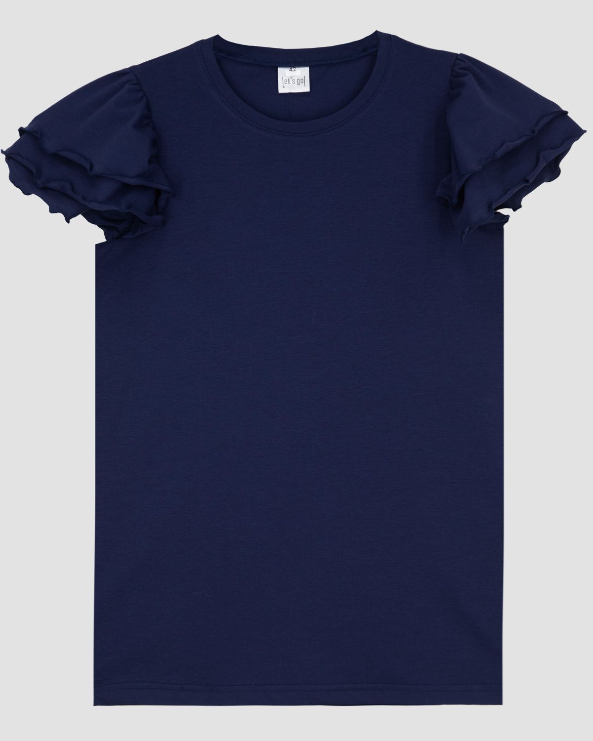 Футболка женская прямого силуэта с рукавами-крылышками. Горловина круглая, обработана воротником из основного полотна. По окату рукава-крылышек сборка, с помощью которой образуется объёмная форма. Низ рукава-крылышек обработан закруткой. Низ изделия обработан швом вподгибку. Модель рассчитана на рост 164-170см.